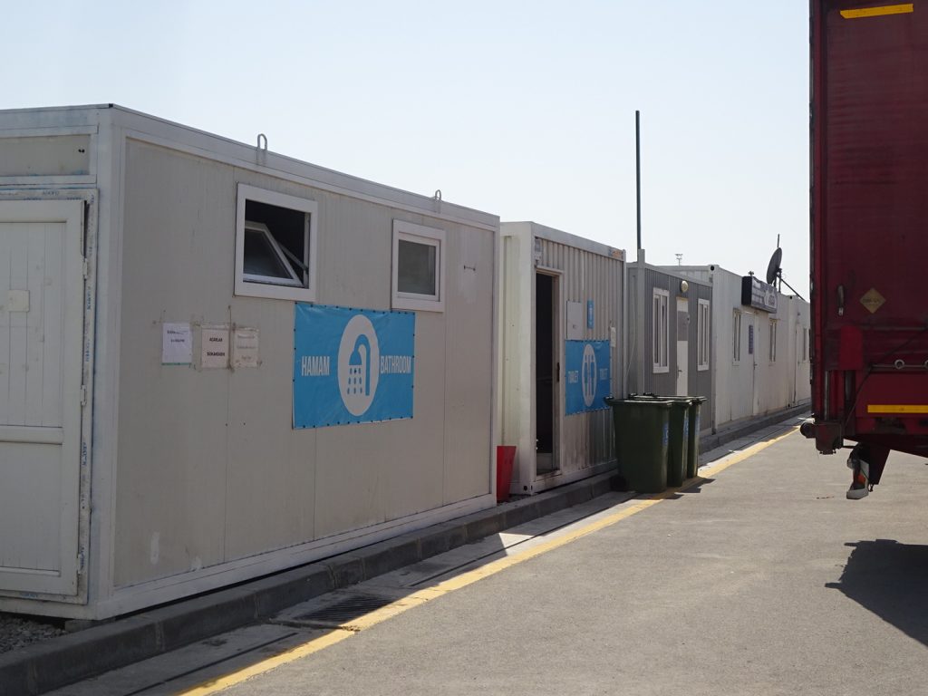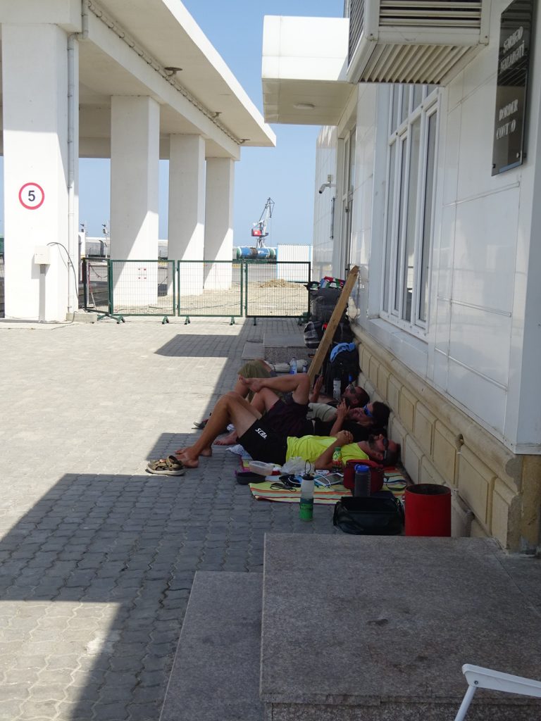 Gegen 18 Uhr erreichen wir den Hafen. Riesig, Unmengen LKWs stehen herum und einige Container (Polizei, Ticketschalter, Klos (baeh), Duschen (immer abgeschlossen), ein Market und ein ‚Cafe‘. Jamie und Maria kommen ca. 1 h spaeter und es ist schoen, dass wir zusammen campen und warten koennen. Die Tickets haben wir gestern abend bezahlt und heute vormittag abgeholt. Wann die Faehre kommt ist absolut unklar und die Ansagen aus dem Faehrbuero schwanken innerhalb von Stunden, jeder hat etwas anderes gehoert.. So haengen wir hier nun in der Hitze, suchen Schatten und warten.. wie lange wissen wir nicht, ich hoffe aber sehr, dass morgen ein Shiff kommt..