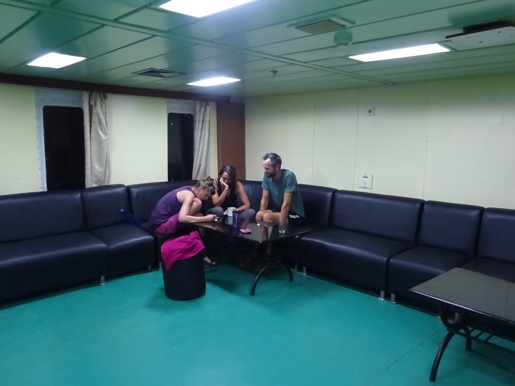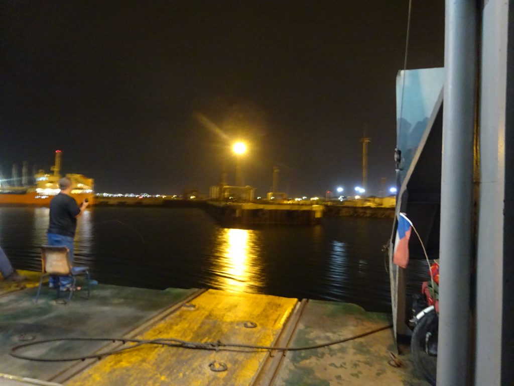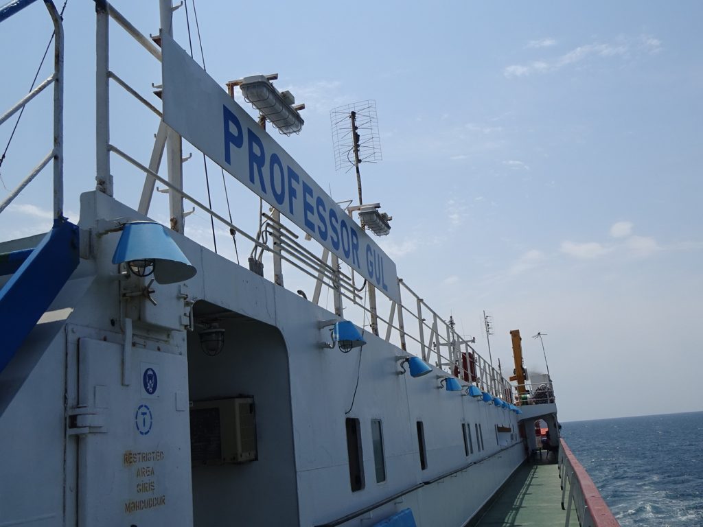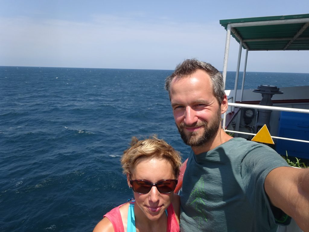 Unsere Faehre (gestatten, Professor Gul) in Baku durften wir in der Nacht von Sonntag auf Montag betreten. Gegen 2 Uhr kam das Signal, Los, Los. Zum Glueck durften alle unmotorisierten Leute als erstes an Bord..Schon sind wir in einer miefigen Kabine ohne Fenster und ohne Ventilation, den Rest der Nacht schwitzen wir vor uns hin.. 3 Duschen und 2 Klos fuer 70 Leute, hauptsaechlich Trucker-Fahrer.. Das Essen an Bord ist OK (abends und mittags immer Huenhchen mit Beilage + Suppe), und als die Faehre nach dem Mittag ablegt laesst es sich mit Fahrtwind auch gut ausshalten. Die Zeit wird vertroedelt, Lesen, Schlafen, Essen, zwischendurch gibt es noch Tee mit Zucker aus Eimern 🙂 Kurz hinter Baku bleibt die Faehre nochmals stehen (ca. 10 h), da zuviel Wind weht.. danach geht es aber ohne Unterbrechung weiter und den Hafen von Aktau erreichen wir gegen 2 Uhr morgens, wo wir mit einem lauten „dawei, dawei“ ans Deck getrieben werden. Unsere Fahrradtaschen sollen wir runter zu den Raedern bringen, hier muessen wir uns im Dieselgestank zwischen den LKWs durchquetschen.