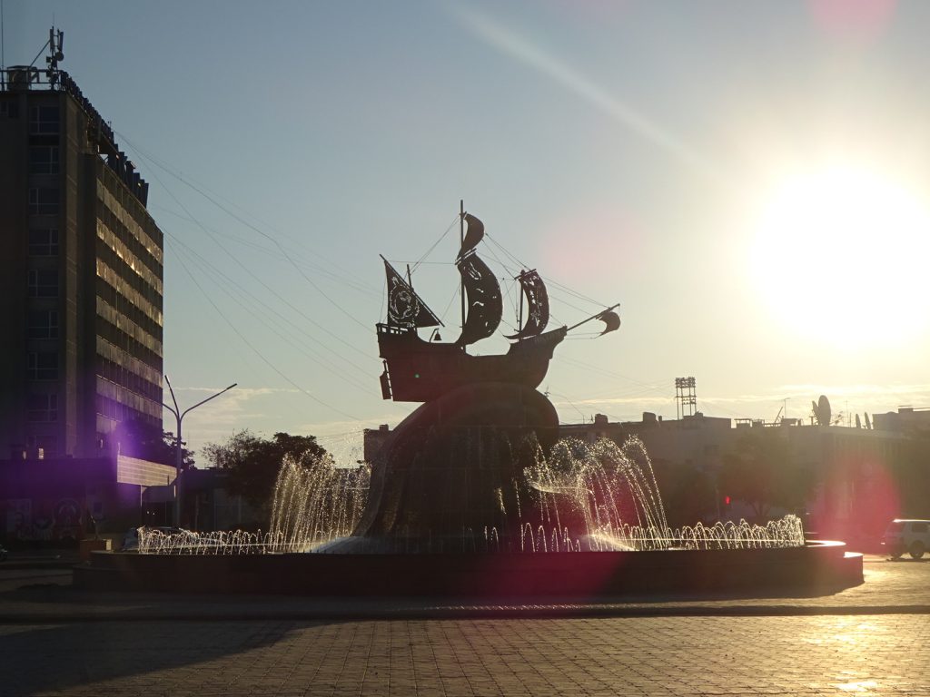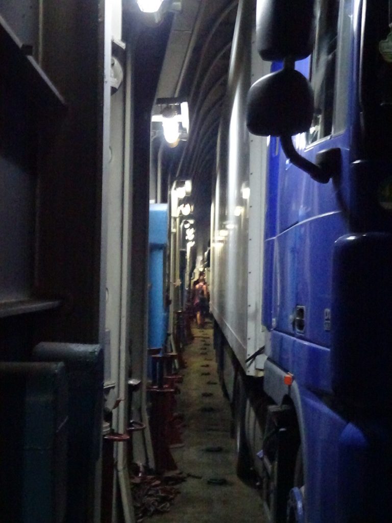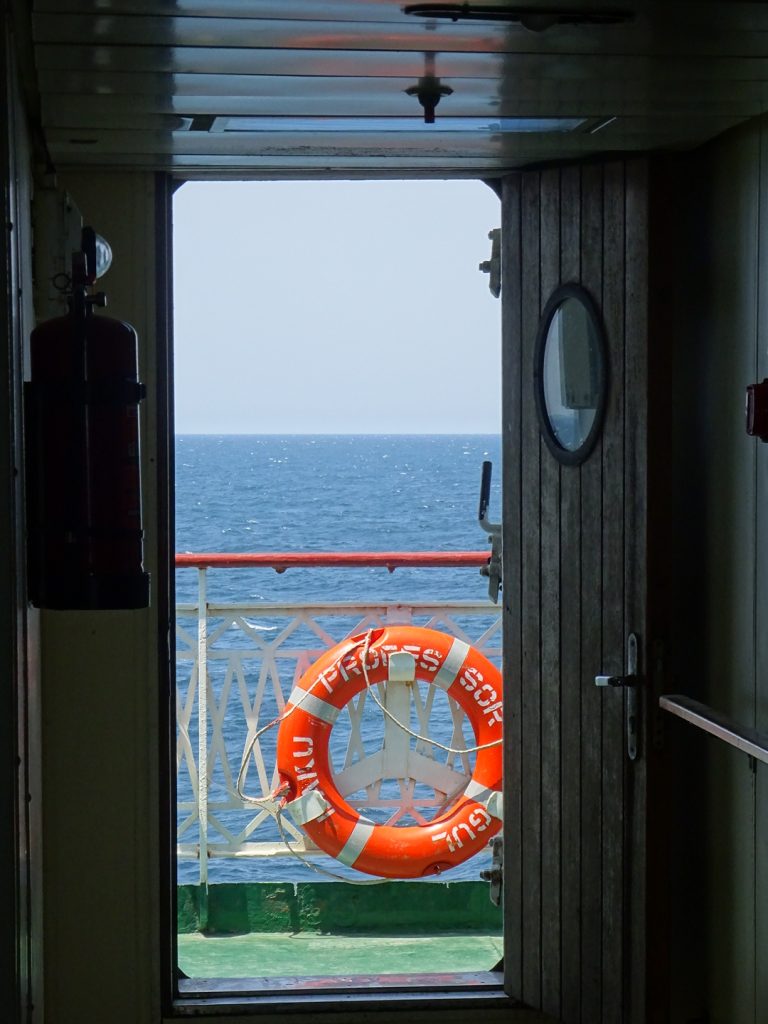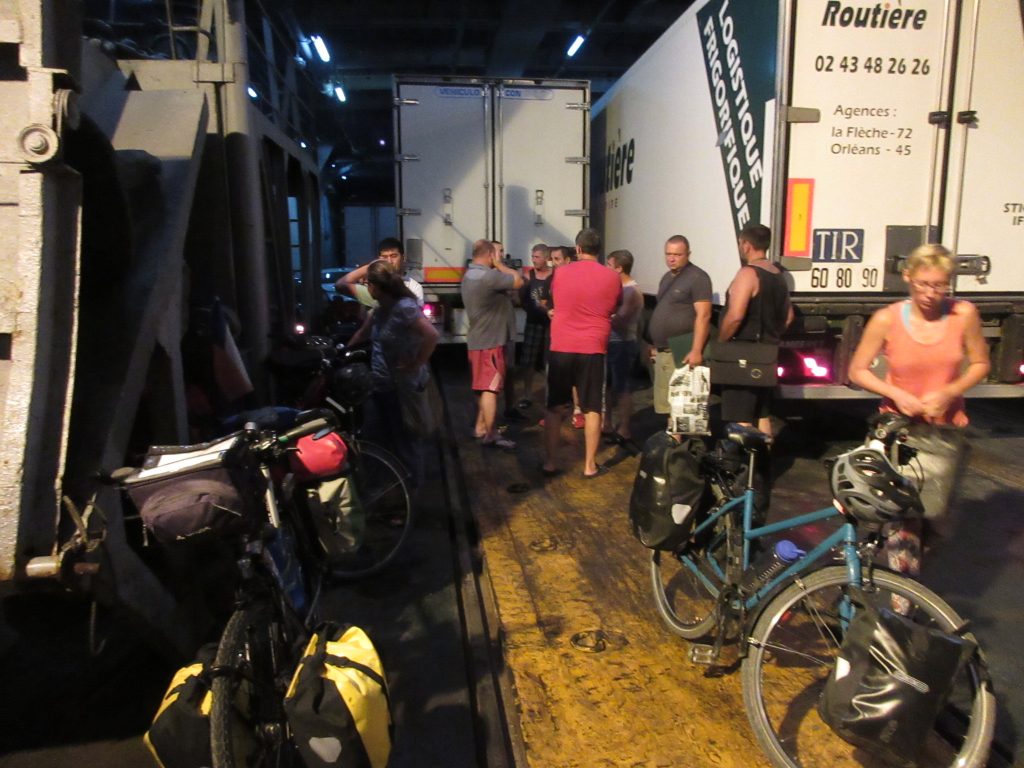 Unsere Faehre (gestatten, Professor Gul) in Baku durften wir in der Nacht von Sonntag auf Montag betreten. Gegen 2 Uhr kam das Signal, Los, Los. Zum Glueck durften alle unmotorisierten Leute als erstes an Bord..Schon sind wir in einer miefigen Kabine ohne Fenster und ohne Ventilation, den Rest der Nacht schwitzen wir vor uns hin.. 3 Duschen und 2 Klos fuer 70 Leute, hauptsaechlich Trucker-Fahrer.. Das Essen an Bord ist OK (abends und mittags immer Huenhchen mit Beilage + Suppe), und als die Faehre nach dem Mittag ablegt laesst es sich mit Fahrtwind auch gut ausshalten. Die Zeit wird vertroedelt, Lesen, Schlafen, Essen, zwischendurch gibt es noch Tee mit Zucker aus Eimern 🙂 Kurz hinter Baku bleibt die Faehre nochmals stehen (ca. 10 h), da zuviel Wind weht.. danach geht es aber ohne Unterbrechung weiter und den Hafen von Aktau erreichen wir gegen 2 Uhr morgens, wo wir mit einem lauten „dawei, dawei“ ans Deck getrieben werden. Unsere Fahrradtaschen sollen wir runter zu den Raedern bringen, hier muessen wir uns im Dieselgestank zwischen den LKWs durchquetschen.