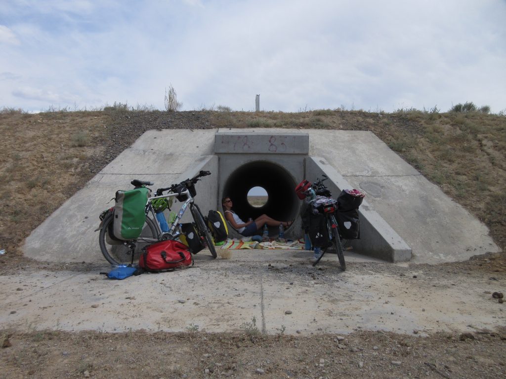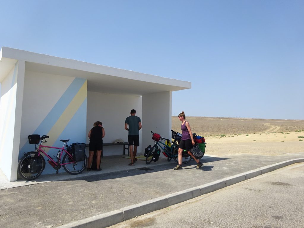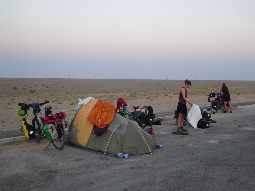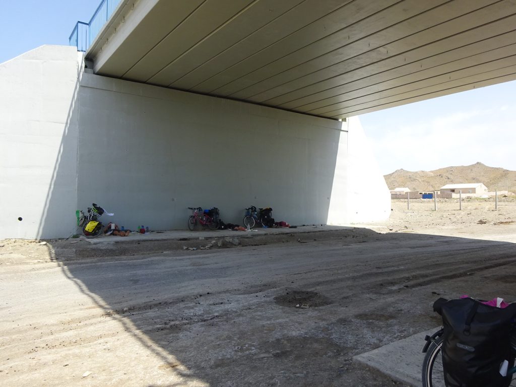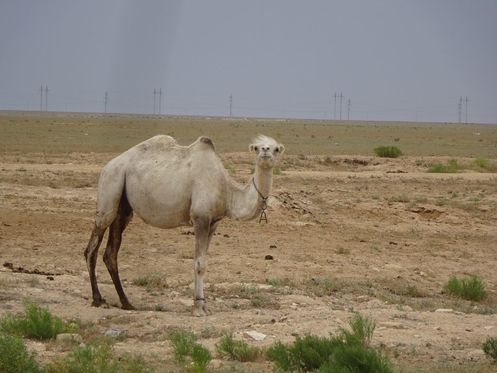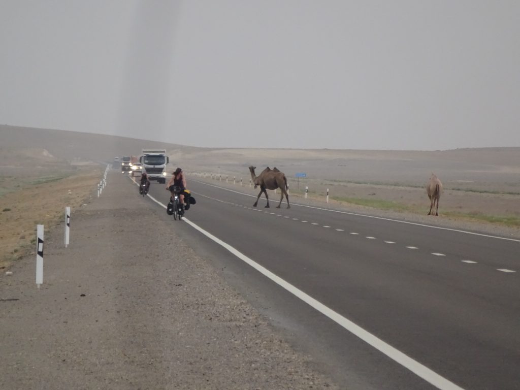 Am naechsten Morgen fahren wir um 7 Uhr los. Zu viert, mit Sue und Julia (D). Raus aus der Stadt, was sich ziemlich stressig gestaltet, enge Staßen, viel Vekehr, staendig den Gestank von Diesel in der Nase.. Irgendwann haben wir es aber geschafft und erblicken aufgeregt die ersten Kamele am Straßenrand..Nach der Fruehstueckspause kommt Wind auf und die Wolken verschwinden.. Wir kaempfen uns vorwaerts, aber es ist sehr anstrengend..Pause in einer Bushaltestelle (Schatten, kein Wind, Plumpsklo auf der anderen Straßenseite). Zwischendurch haelt ein Transporter, ca. 8 Maenner/Jungs steigen aus.. die ueblichen Frage, wo kommen wir her – Germania, ooh 🙂 Stolz präsentieren sie ihre Fracht: BlueFilters für reines Wasser, wohl ein deutsches Produkt.. dann ist Selfie-Runde angesagt, wir stellen uns alle im Kreis auf und rufen abwechselnd „BlueFilters“, „Germania“, „Kasachstan“ 😀 Dann fuellen sie uns noch unsere Flaschen mit Bluefilter-Wasser auf. Sehr nett :). Gegen 16:30 fahren wir weiter, kommen aber nicht weit.. es ist unerträglich heiß und beim nächsten Straßenschild werfen wir uns wieder in den Schatten. Das Wasser hat bestimmt auch 40 C, es ist unangenehm heiß beim Trinken..Immerhin hat der Wind gedreht und wir fahren bis zum nächsten Ort, insgesamt über 80km. Wir müssen dringend unsere Wasservorräte aufstocken (für jeden 9 Liter) und wollen morgen wieder früh los..