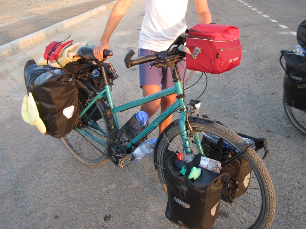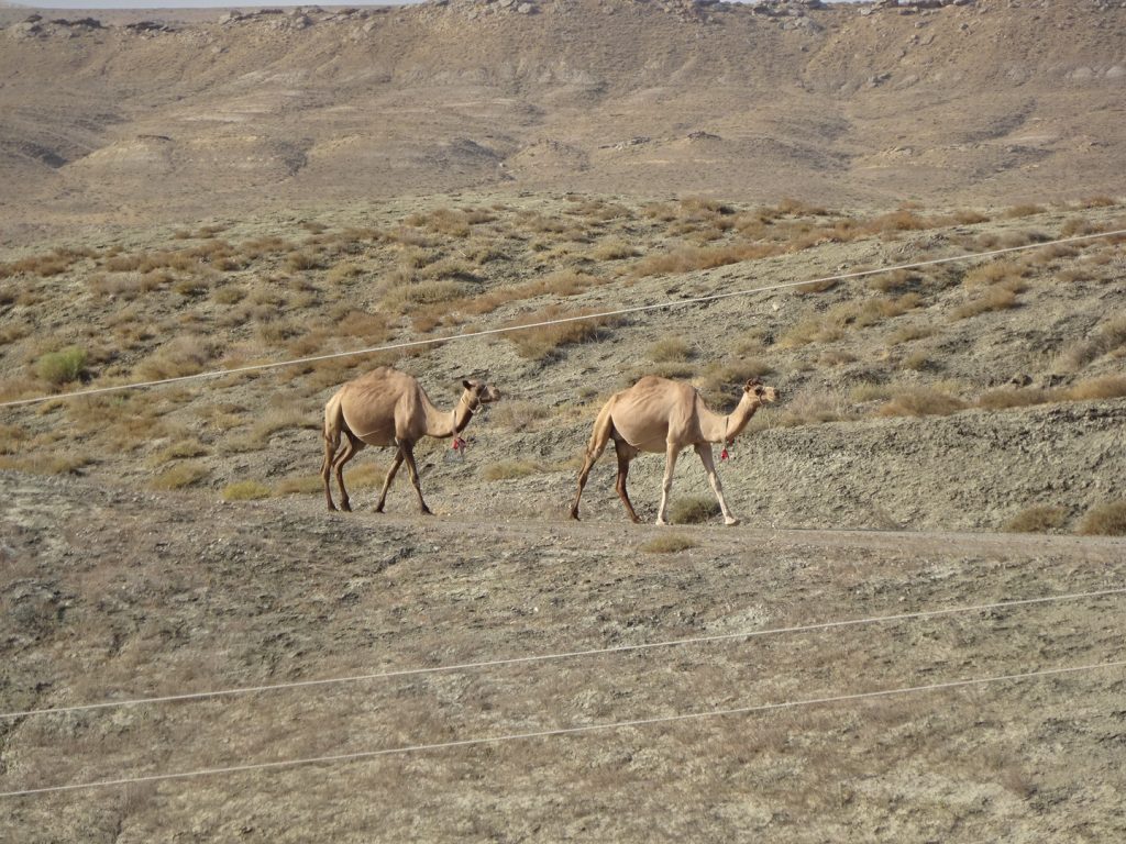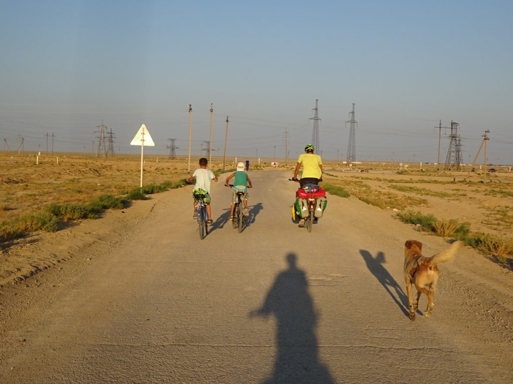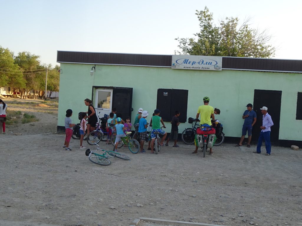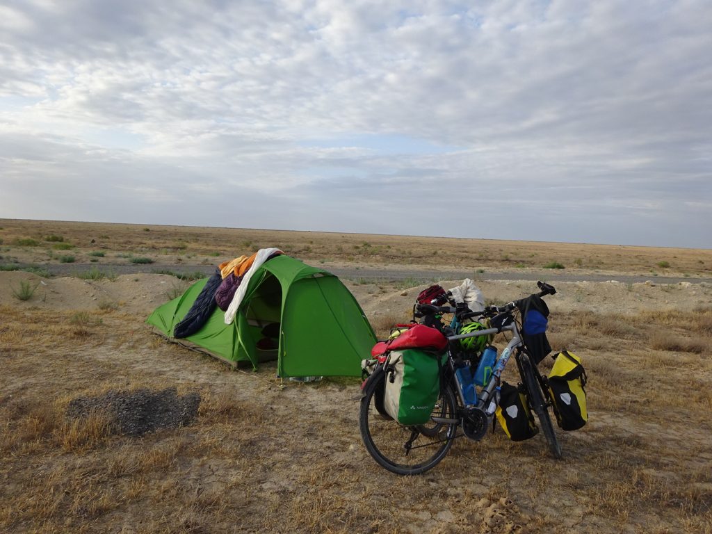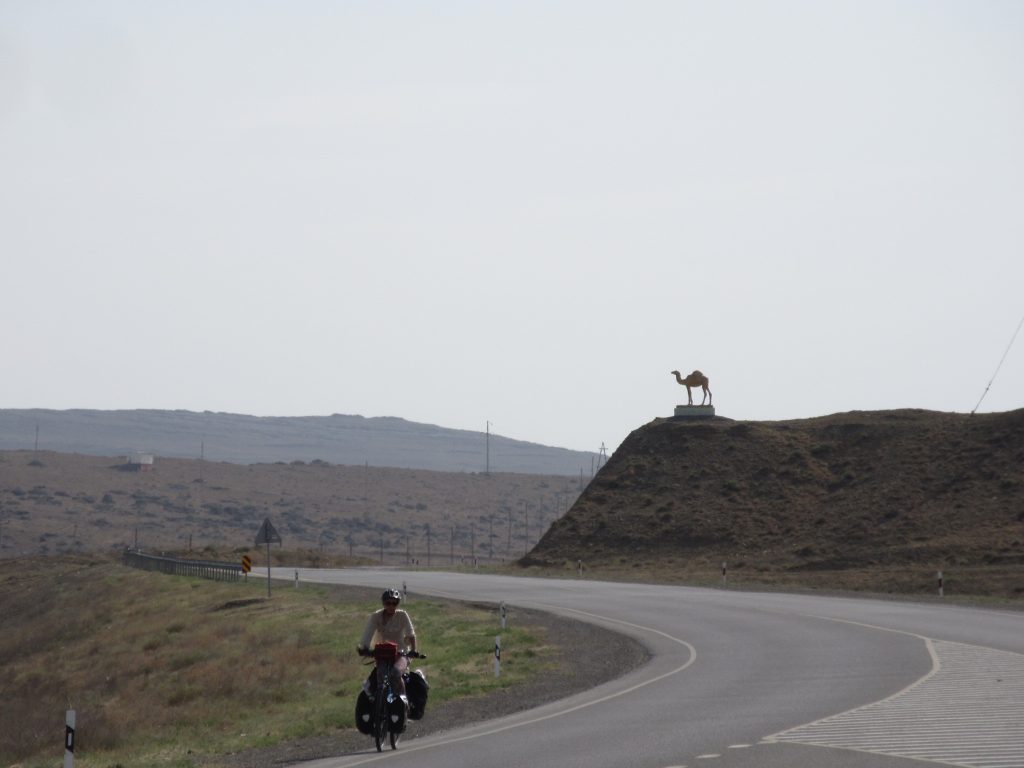 Am naechsten Morgen fahren wir um 7 Uhr los. Zu viert, mit Sue und Julia (D). Raus aus der Stadt, was sich ziemlich stressig gestaltet, enge Staßen, viel Vekehr, staendig den Gestank von Diesel in der Nase.. Irgendwann haben wir es aber geschafft und erblicken aufgeregt die ersten Kamele am Straßenrand..Nach der Fruehstueckspause kommt Wind auf und die Wolken verschwinden.. Wir kaempfen uns vorwaerts, aber es ist sehr anstrengend..Pause in einer Bushaltestelle (Schatten, kein Wind, Plumpsklo auf der anderen Straßenseite). Zwischendurch haelt ein Transporter, ca. 8 Maenner/Jungs steigen aus.. die ueblichen Frage, wo kommen wir her – Germania, ooh 🙂 Stolz präsentieren sie ihre Fracht: BlueFilters für reines Wasser, wohl ein deutsches Produkt.. dann ist Selfie-Runde angesagt, wir stellen uns alle im Kreis auf und rufen abwechselnd „BlueFilters“, „Germania“, „Kasachstan“ 😀 Dann fuellen sie uns noch unsere Flaschen mit Bluefilter-Wasser auf. Sehr nett :). Gegen 16:30 fahren wir weiter, kommen aber nicht weit.. es ist unerträglich heiß und beim nächsten Straßenschild werfen wir uns wieder in den Schatten. Das Wasser hat bestimmt auch 40 C, es ist unangenehm heiß beim Trinken..Immerhin hat der Wind gedreht und wir fahren bis zum nächsten Ort, insgesamt über 80km. Wir müssen dringend unsere Wasservorräte aufstocken (für jeden 9 Liter) und wollen morgen wieder früh los..
