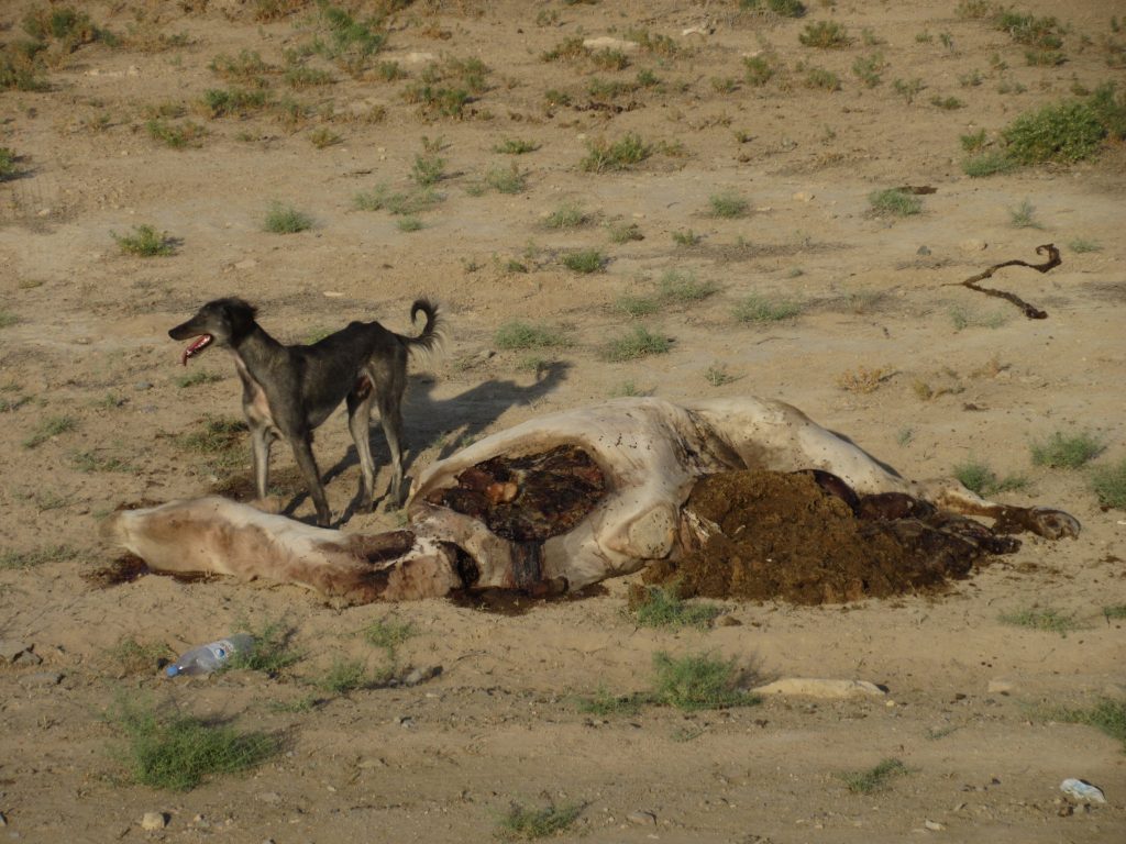 Ich raffe die Wüstentour nun mal ein bisschen zusammen 🙂 Der nächste Tag ist ebenso heiß, bis zur Mittagspause ist es OK, danach ist es wie im Backofen. Beim Einatmen brennt es manchmal in der Nase, so wie in der Sauna..am Nachmittag setzt wie eingeschaltet auf einmal ein garstiger Gegenwind ein und nach guten 60 km geben wir auf. Schnurgerade Straße, die man mit Mühe mit 7 km/h befahren kann..wir hoffen, das es morgen anders aussieht und schlagen die Zelte ein gutes Stück von der Straße entfernt an einer Gasleitung auf. Pferde und Kamele sagen gute Nacht 😀