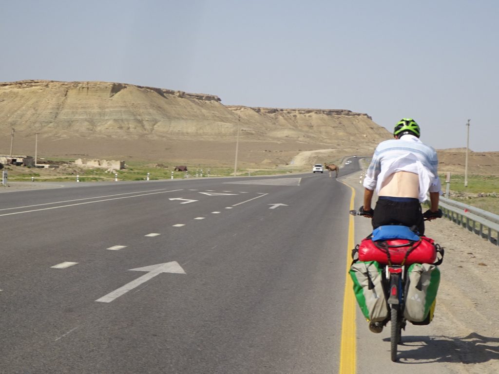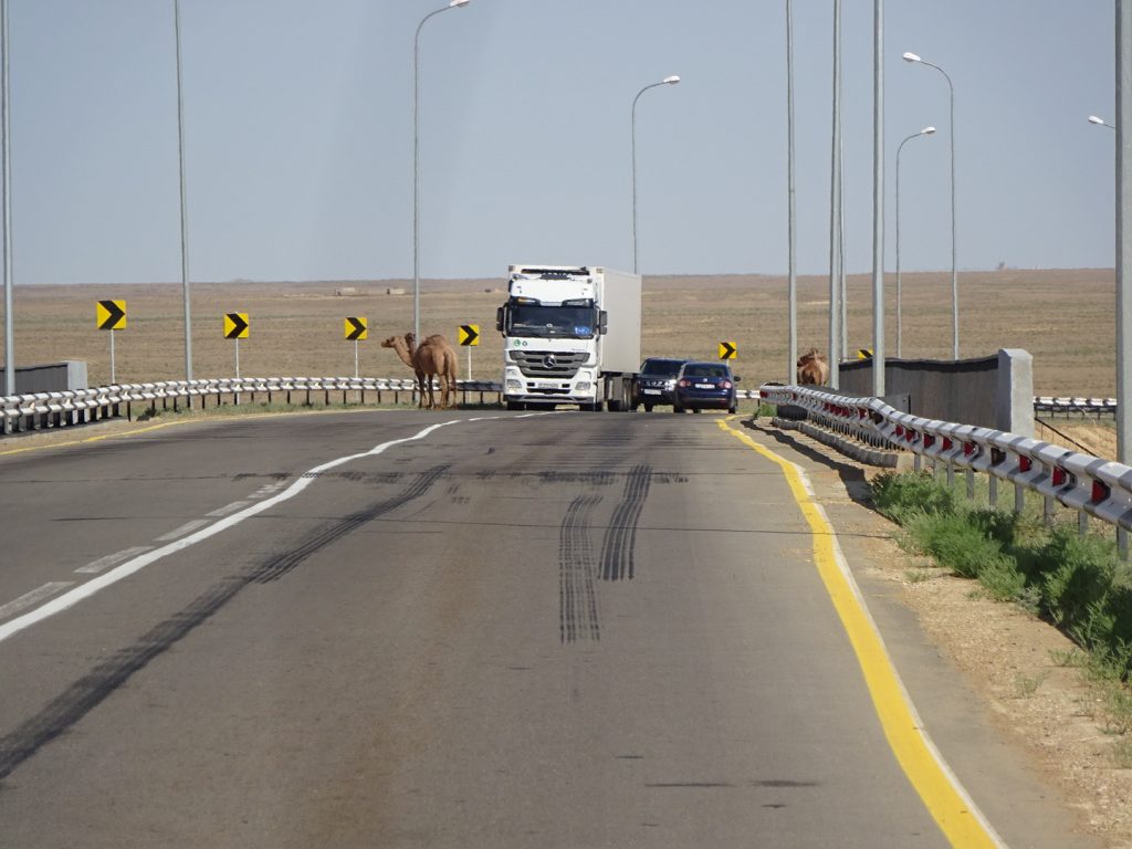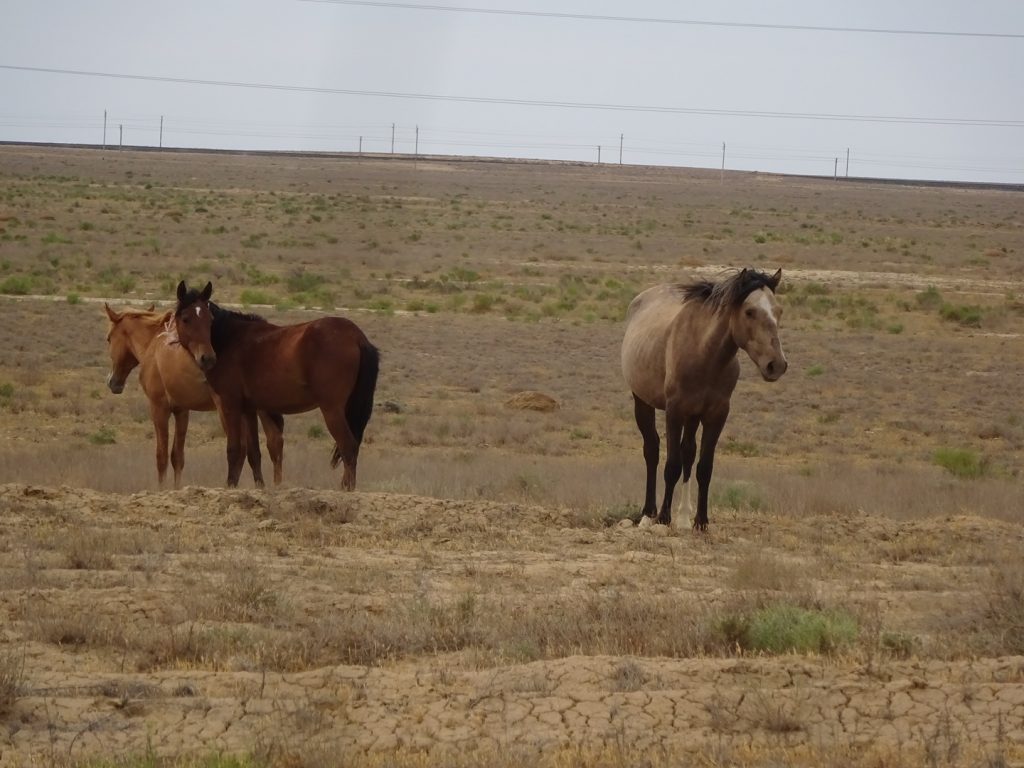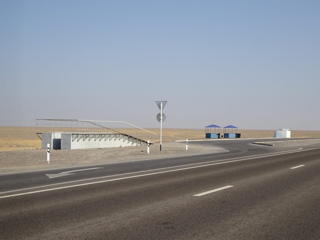 Viele Gruesse aus Beyneu, an der Grenze zu Usbekistan. Die letzten Tage haben wir uns durch die kasachische Steppe gequealt. Navigation? Unnoetig, es geht immer geradeaus und es gibt nur eine Strasse.. Schatten? Selten, nur an schoenen Orten wie Bushaltestellen oder Strassenunterfuehrungen.. Dafuer gabs viele Kamele und Pferdeherden 🙂