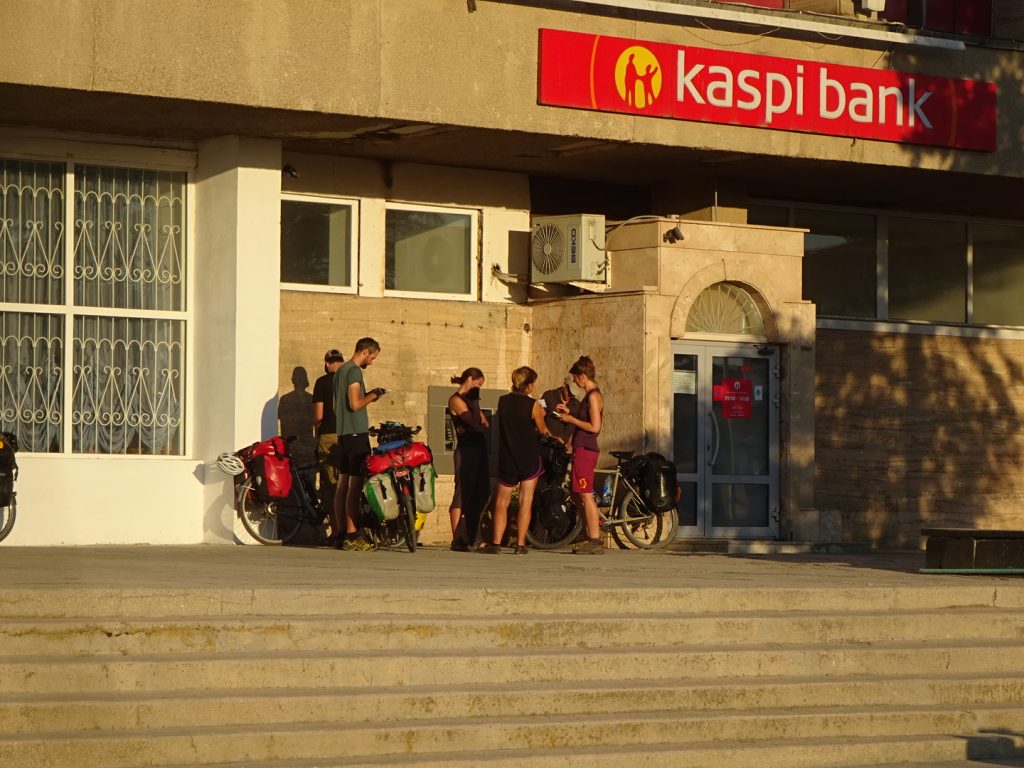 Kurz darauf kommen Grenzsoldaten an Bord, durchwuehlen saemtliche Gepeackstuecke aufs Genaueste, dann werden wir alle von Bord getrieben und stehen verfroren am Hafen. Ein kleiner Transporter karrt alle Passagiere nach und nach zur Passkontrolle. Kurz warten, dann sind wir schon eingereist, mit 2 Stempeln auf unserer „migration card“ muessen wir uns keine Sorgen um eine Registrierung machen. Danach zurueck zum Schiff, Raeder beladen und wie die LKWs ab zur Frachtkontrolle. An Bord waren an die 10 Radfahrer, Max, Maria, Jamie und ich sind die ersten an der Kontrollstation und der Grenzmann beginnt mit einer genauen Untersuchung jeder der 5 Taschen an jedem Fahrrad. Allerdings duerfen wir selber das ganze Zeug aus den Taschen wuehlen, nach seinen Anweisungen, das ist ganz angenehm. Bei Maria geht er auch noch gruendlich vor, dann sieht er wieviele Radler noch kommen und kapituliert.. Wir sollen zur naechsten Station fahren und sagen, dass wir alle kontrolliert worden sind 😀 Nach einigem hin und her an der letzten Station haben wir es endlich geschafft.. 6 Uhr bzw. mit erneuter Zeitumstellung 7 Uhr in Kasachstan, wir fuehlen uns als haetten wir die Nacht durchgemacht und suchen erstmal einen Laden, der schon geoeffnet und Kaffee und Wifi hat :). Hotel gebucht und zum Glueck duerfen wir schon einchecken und liegen um 10 Uhr morgens im Bett..