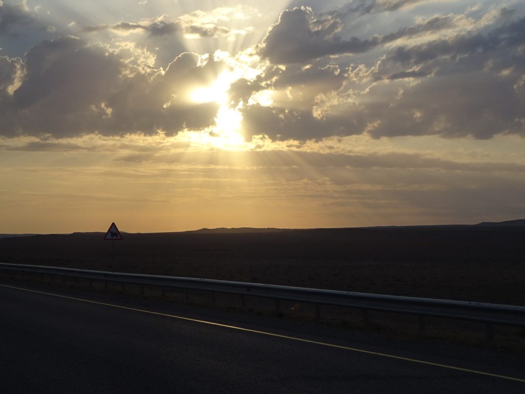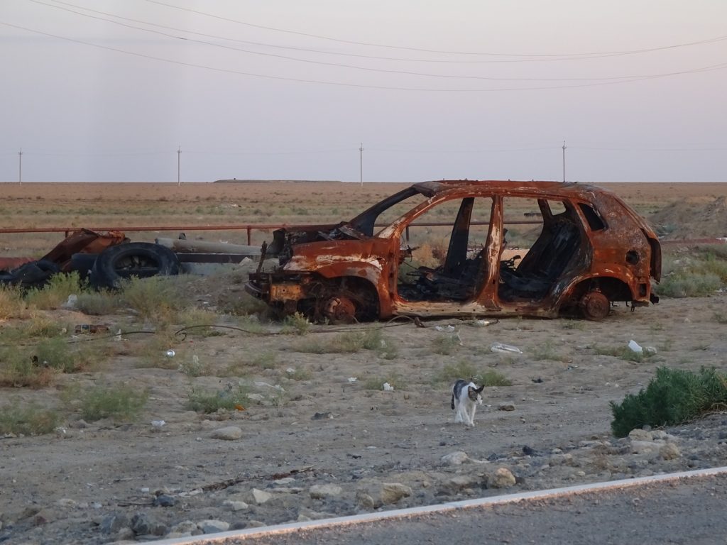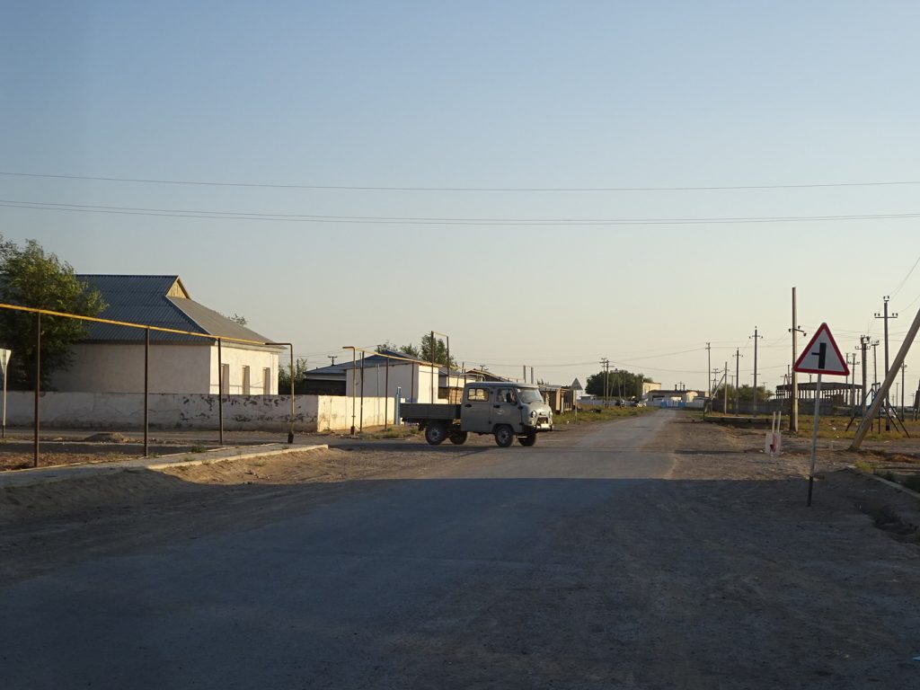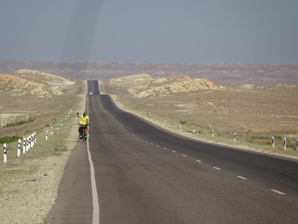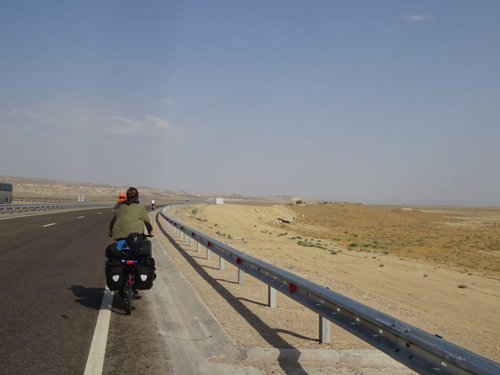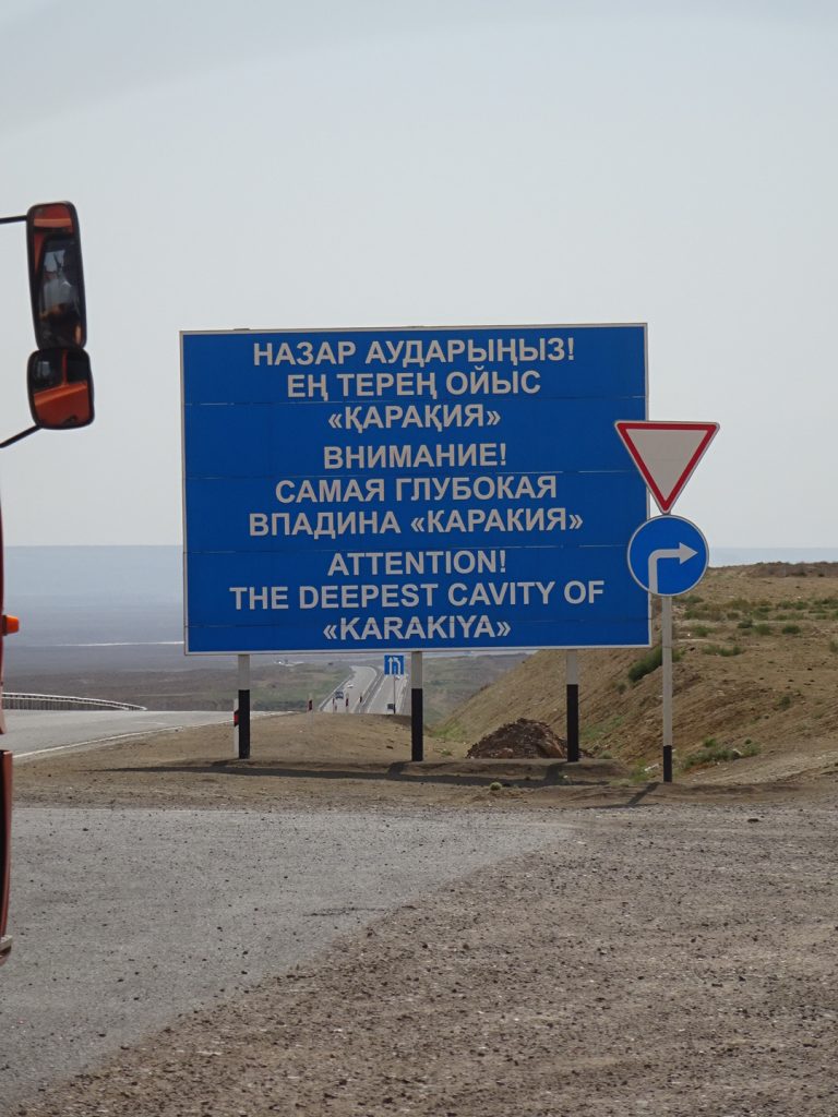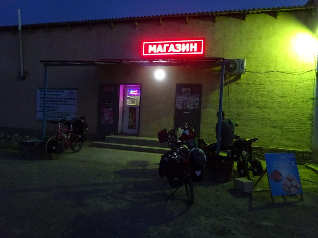 Nach insgesamt 7 Tagen haben wir die 470 km bis nach Beyneu hinter uns gebracht. Eine neue Erfahrung, neue Landschaft und neue Fahrbedingungen. Zwei nette Trucker-Begegnungen hatten wir noch. Einmal haben uns 2 Trucker Tee gekocht und Wasser geschenkt. Sie haben an der Stelle eines ehemaligen Teehauses seit 3 Tagen auf den Service gewartet, einer ihrer LKWs war kaputt (dieses Wort funktioniert scheinbar international^^). Ein anderes Mal hat ein LKW-Fahrer einfach heimlich unser Frühstück bezahlt 🙂 in einem weiteren Teehaus. Die Teehäuser sind wichtige Anlaufstellen. Hier gibt es einfaches Essen (Eier, Brot, Wurst, Plov (Reis), Manti, Wasser!!), Tee, Zigaretten, Alkohol und mit Glück auch Snickers und Co. Sie gibt es ca. alle 60 – 80 km, manchmal sind einige Teehäuser geschlossen, dafür findet man welche, die nicht in den Karten verzeichnet waren..