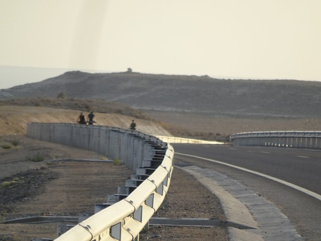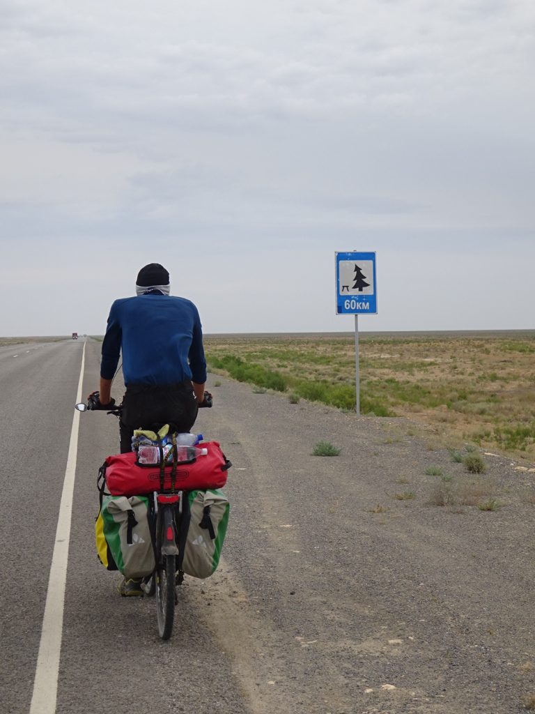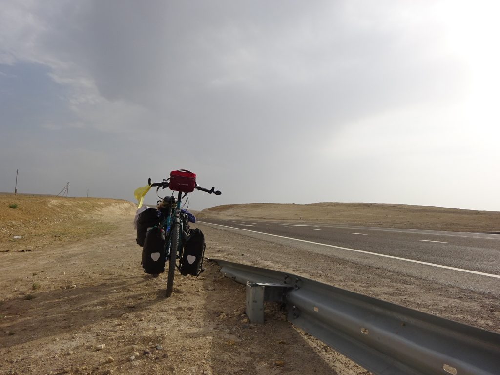 Am Mittag des nächsten Tages verlassen uns die guten Winde allerdings wieder..die Temperaturen werden etwas erträglicher, aber den ganzen Tag kämpfen wir mit Seitengegenwind, maximal 12 km/h sind möglich. Das Ganze ist sehr zermürbend, die Stecke wird nur von Autofahrern aufgelockert, die ein Selfie machen wollen (meistens nur mit Max). 2 mal wurde ich für einen Mann gehalten und mir einmal die Hand geschüttelt (mit nachfolgender Entschuldigung :p) und einmal fast, im letzten Moment bemerkte der Kasache seinen „fatalen Fehler“ :D. Achso, die Leute sehen hier schon moderat asiatisch aus, so langsam wird es exotisch ^^