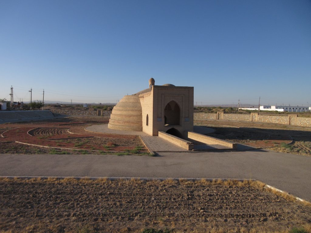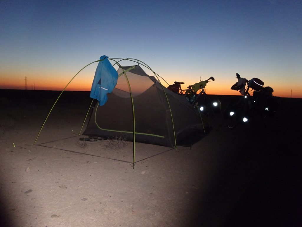 Am nächsten Morgen machen wir uns auf Richtung Samarkand. Schauen uns noch ein Mausoleum in Bukhara an und dann nichts wie raus aus der Stadt. Die Strecke führt größtenteils durch bewohnte Gebiete, so kann man sich zwar an jeder Ecke mit Snacks und Limo eindecken, auf der anderen Seite wird man auch den ganzen Tag mit Pfiffen und „Hello“-Rufen, sowie Hupen begleitet..das ist meistens ja ganz nett, aber nach einigen Stunden, gegen Abend ist die Motivation dann aufgebraucht, und zum Teil reagiere ich nicht mehr. Ich winke sowieso lieber den Frauen auf den Feldern zu, als grölenden Männern am Straßenrand und es ist schön zu sehen, wie sich manche Leute richtig freuen, uns zu sehen, dann freuen wir uns auch 🙂 Manche Kindergruppen rasten förmlich aus wenn sie uns sehen „Priviet, priviet“ wildes Winken und Gerenne :). Am ersten Tag fahren wir gute 80 km und sind dann nochmal in einem kleinen Steppengebiet. Perfekt wie ich finde :D, auch wenn es super anstrengend war, so gab es doch auch viele gute Punkte: Easy Zeltplatz Findung, Ruhe, Niemand da, keine Mücken, flacher Boden, kein Tau, am Morgen ist alles trocken.