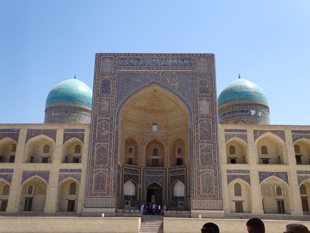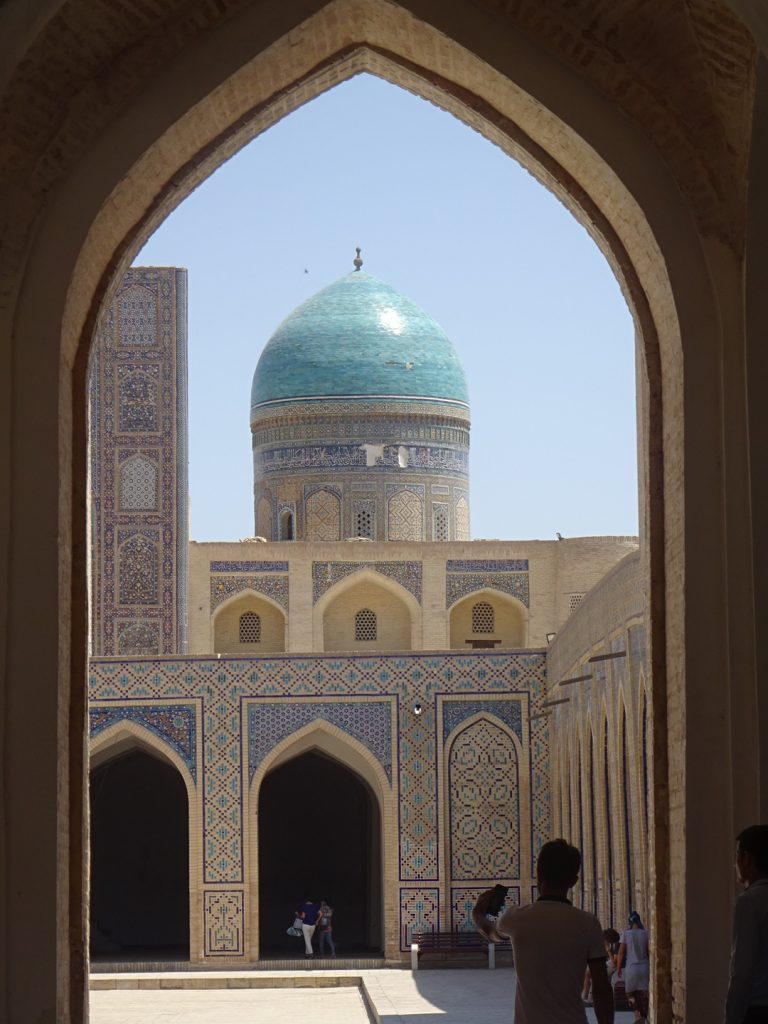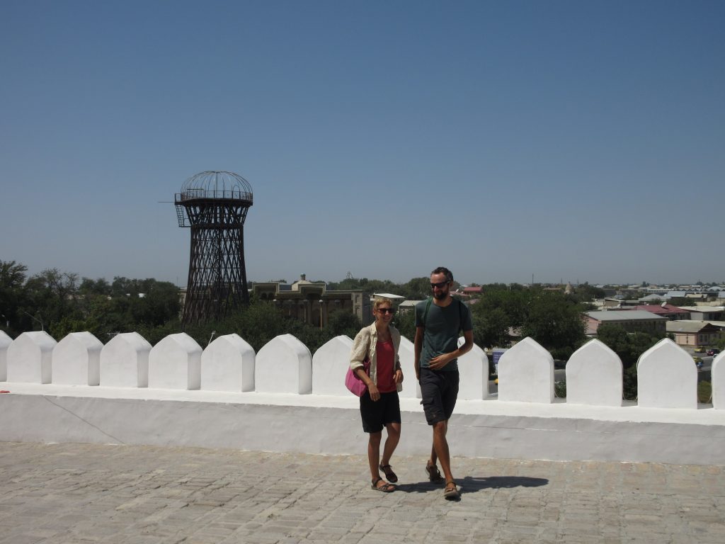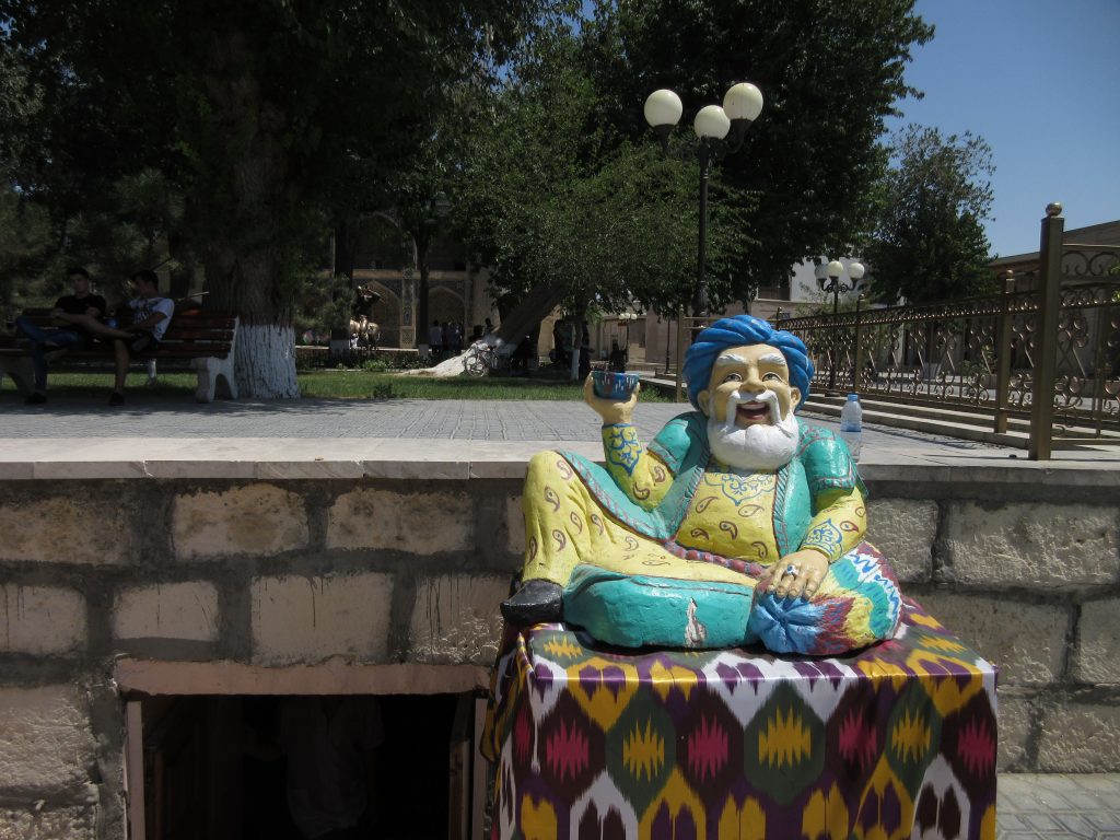 Am nächsten Tag gucken wir uns das alte Stadtzentrum von Bukhara an. Hier sieht es ähnlich aus wie in Khiva, es gibt nur noch mehr beeindruckende Gebäude. Meistens soll man allerdings Eintritt bezahlen und bei manchen Attraktionen hat man das Gefühl, dass sich einfach jemand an den Eingang setzt und zu allen Touristen „Ticket“ sagt..später gehen wir noch in einen Laden, der „Bella Italia“ heißt, hier gibt es zur Abwechslung mal Pizza und einen Capuccino für mich 🙂 Abends gehen wir noch Essen mit Rakhim, einer der Jugendlichen vom vorherigen Abend. Er wundert sich darüber, dass ich mit ihm spreche als Max kurz auf dem Klo verschwindet (das sagt er natürlich nur Max, als ich auf dem Klo verschwinde :D). Er wundert sich darüber, dass wir oft im Zelt übernachten, er dachte, dass West-Menschen immer den höchsten Luxus bräuchten. Das Thema Homo-Ehe kommt kurz auf, er zeigt uns ein Foto von einem Mann im Brautkleid und einem Bräutigam, dass im Internet kursierte und nun nimmt er an, dass so jegliche Homo-Eheschließung aussieht..Eieiei..ansonsten gucken er und seine Freunde die Serie „Friends“ zum englisch aufpolieren.. hier wird wohl wieder ein bestes Bild des westlichen Lotterlebens manifestiert..