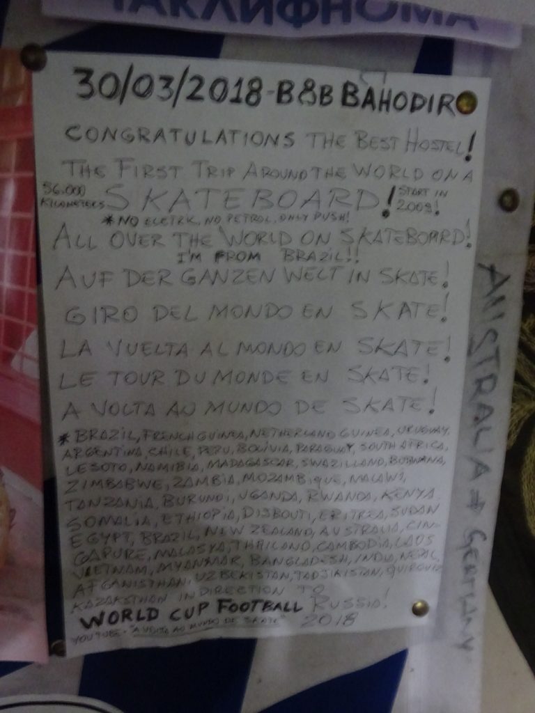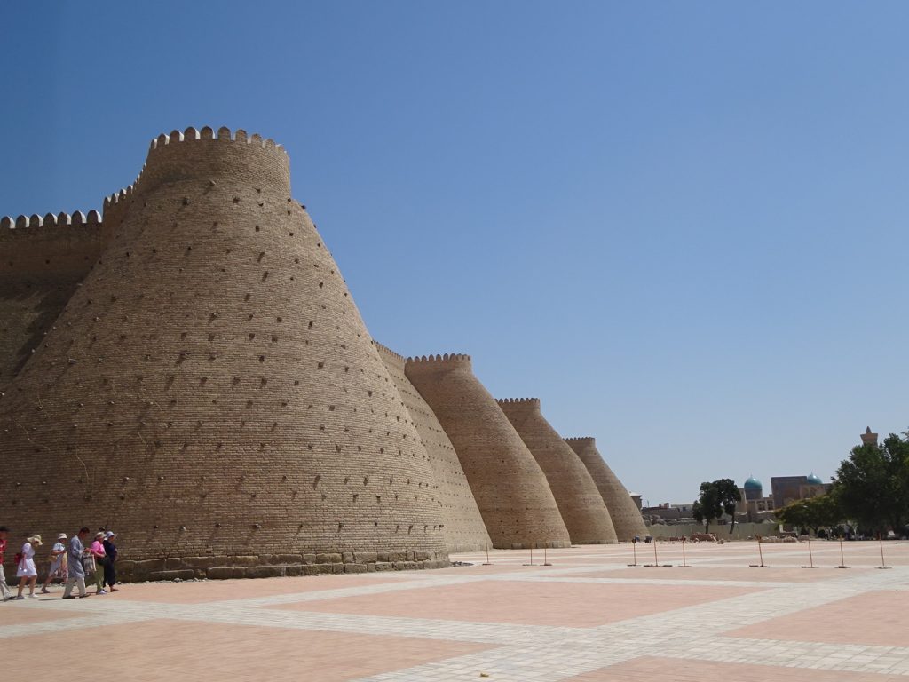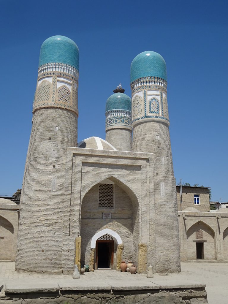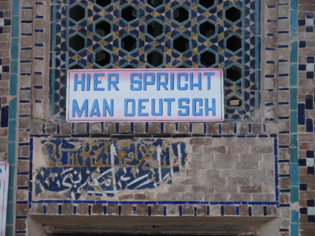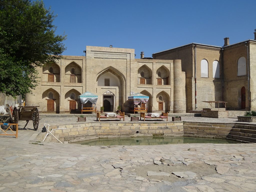 Am nächsten Tag gucken wir uns das alte Stadtzentrum von Bukhara an. Hier sieht es ähnlich aus wie in Khiva, es gibt nur noch mehr beeindruckende Gebäude. Meistens soll man allerdings Eintritt bezahlen und bei manchen Attraktionen hat man das Gefühl, dass sich einfach jemand an den Eingang setzt und zu allen Touristen „Ticket“ sagt..später gehen wir noch in einen Laden, der „Bella Italia“ heißt, hier gibt es zur Abwechslung mal Pizza und einen Capuccino für mich 🙂 Abends gehen wir noch Essen mit Rakhim, einer der Jugendlichen vom vorherigen Abend. Er wundert sich darüber, dass ich mit ihm spreche als Max kurz auf dem Klo verschwindet (das sagt er natürlich nur Max, als ich auf dem Klo verschwinde :D). Er wundert sich darüber, dass wir oft im Zelt übernachten, er dachte, dass West-Menschen immer den höchsten Luxus bräuchten. Das Thema Homo-Ehe kommt kurz auf, er zeigt uns ein Foto von einem Mann im Brautkleid und einem Bräutigam, dass im Internet kursierte und nun nimmt er an, dass so jegliche Homo-Eheschließung aussieht..Eieiei..ansonsten gucken er und seine Freunde die Serie „Friends“ zum englisch aufpolieren.. hier wird wohl wieder ein bestes Bild des westlichen Lotterlebens manifestiert..