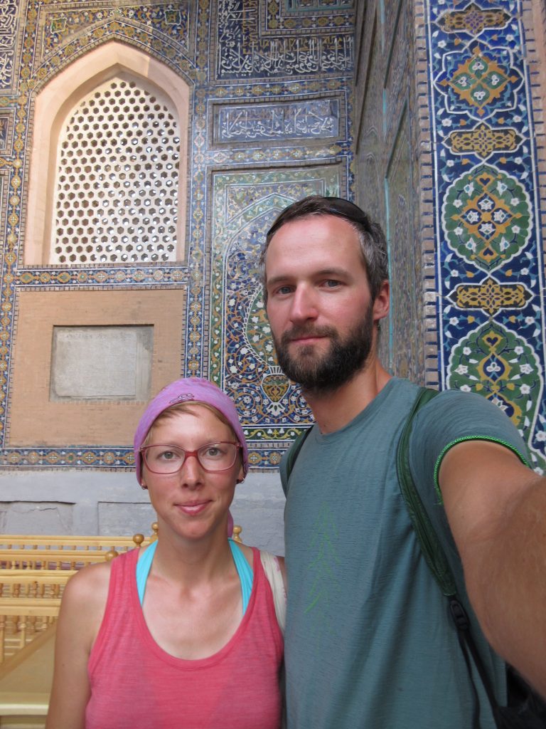 Die nächsten beiden Tage sind wir hier, gucken uns die Stadt an, die nochmals mehr alte Gebäude (Hauptsächlich Mausoleen und Medresen (ehem. Koranschulen)). Der Eintritt zum Hauptplatz „Registan“ ist rassistisch regelementiert: 1000 Sum für Usbeken, 2000 Sum für Zentralasiaten und 30 000 Sum (ca. 3.5 Eu) für alle anderen Menschen..ja, es ist nicht so viel, aber der Unterschied ist doch sehr krass..Max fragt dann an der Kasse, „what if I tell you that I am from Usbekistan.. 😉 ?“.. nach kurzem hin und her meint der Typ „OK, 50 000 für euch beide, ich geb den Leuten Bescheid“. Zack steckt er sich das Geld in die eigene Tasche und ruft den Einlassern zu „Ok, OK“, die lächeln wissend und wir stehen irgendwie ein bisschen dumm da 😀 es ging so schnell, da hätten wir doch lieber die 60 000 bezahlt und ein echtes Ticket bekommen, oder mehr verhandelt aber nun ^^