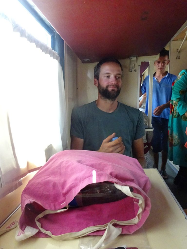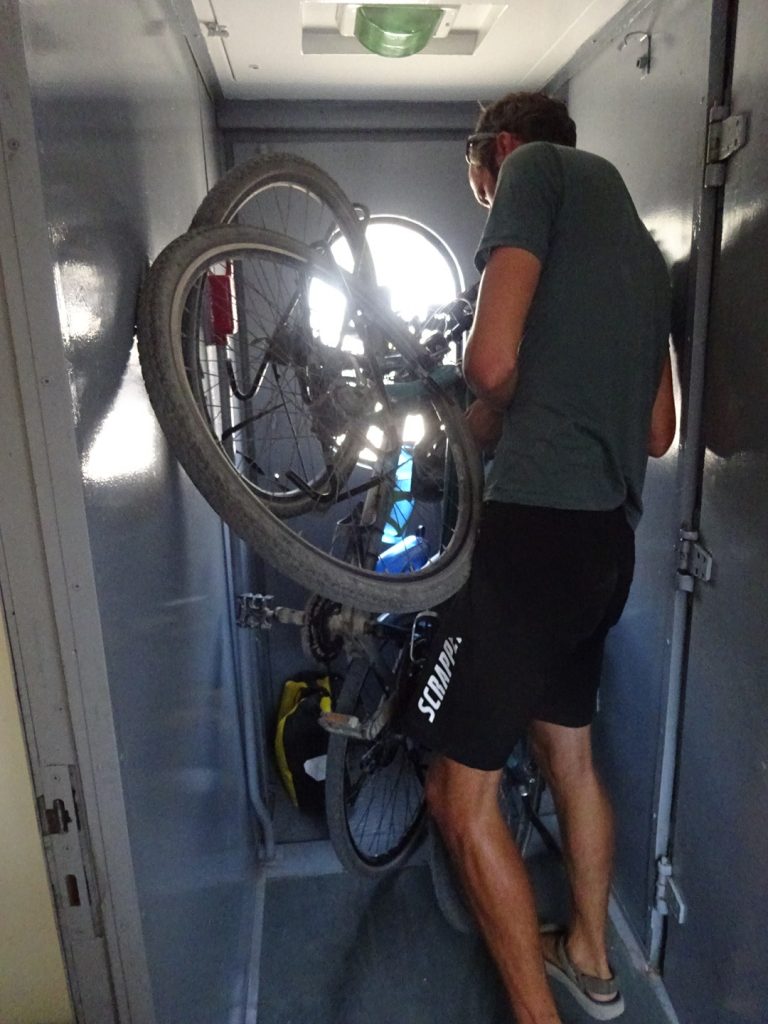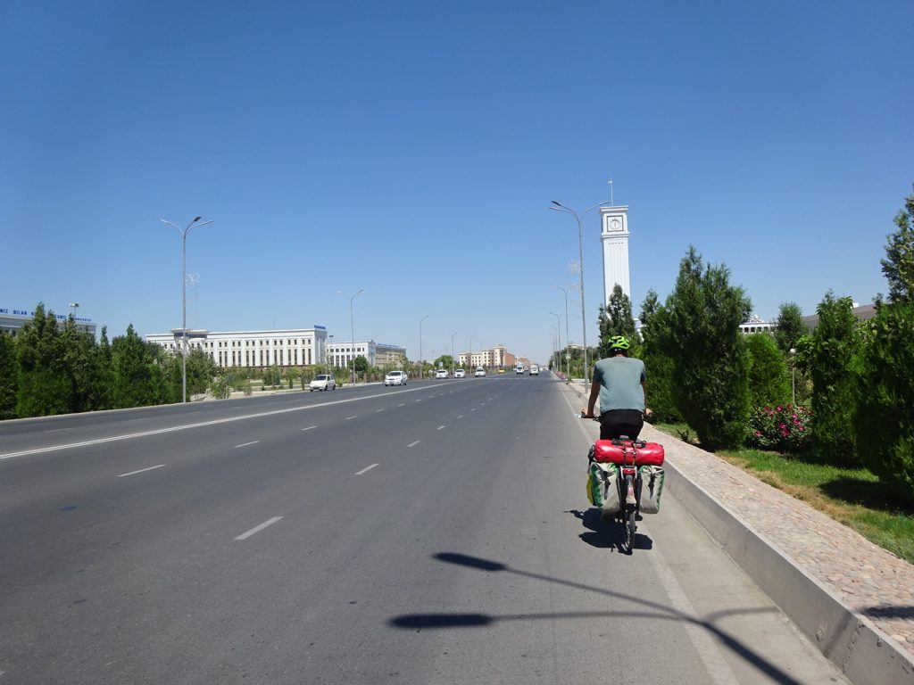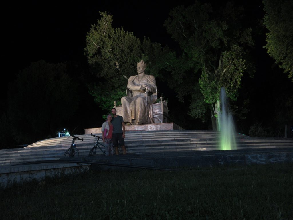 Am nächsten Morgen checken wir gegen 11 Uhr aus dem Hotel, eiern noch ein bisschen durch die Gegend, kaufen Proviant und Wasser und warten im Schatten eines großen Sowjet-Denkmals, bis wir zum Bahnhof fahren. Der Bahnhof liegt nahezu verlassen da, keine Menschenmengen, nichts.. Wir müssen die Räder durch einen Personenmetalldetektor schieben, Ausweis&Ticket-Kontrolle.. drinnen wird wie am Flughafen nochmals das gesamte Gepäck durchleuchtet, Max eine Radtasche muss 3 mal durch den Detektor, dann gucken wir den Inhalt durch.. Batterien? Das kleine erste Hilfe-Set? Keine Ahnung, aber die Gasflasche in meinen Taschen hat niemanden interessiert :D. Gut, nun ist es ca. 14:15, und wir warten auf den Zug, der 15:50 abfahren soll. Die Wartehalle füllt sich mit weiteren Zugreisenden, es gibt saubere Toiletten und einen Snackshop, und ein Gleis ^^ Dann ist es soweit, der Zug fährt ein, und wir schieben die Räder zu unserem Waggon. Der Schaffner (an jedem Waggon wartet einer) zeigt uns, wo wir die Räder abstellen sollen (hochkant!) und dann sitzen wir endlich verschwitzt auf unseren Plätzen. Es gibt natürlich keine Klimaanlage, nur ein paar Fenster und gute 40°C.. Der Schaffner geht um und verteilt in Plastik eingeschweißte Bettlaken und Handtücher und die Leute beginnen, sich ihr Lager zu bereiten. Jeder Zugreisende hat eine Liege für sich und schon bald liegen auch Max und ich auf unseren Liegen und schwitzen ein schweres Kopfkissen und die Laken voll :P. Zwischendurch geht der Schaffner noch mit einem Kessel durch die Gegend und schenkt den Leuten heißes Wasser in ihre Becher und Teekannen. In Bukhara (nach 420 km und ca. 7 !! h Fahrt) kommen wir gegen 23 Uhr an und sind ganz schön fertig. Jetzt schnell noch die 15 km bis zum Hotel fahren. Dann die schöne Überraschung: die Position des Hotels auf googlemaps stimmt nicht und auch in der Nähe ist nichts zu entdecken.. Wir fragen Leute, die auf der Straße sitzen, sie kennen das Hotel nicht und meinen, dass die angegebene Adresse auf 3 Häuser in der Straße zutreffen kann.. Oh mann.. Im Hotel geht auch niemand ans Telefon.. am Ende streunen wir mit einer kleinen Gruppe Jugendlicher durch dunkle Straßen, sie meinen, dass unser Hotel vielleicht in einer der Seitenstraßen liegt? Nein.. wir wollen dann schon wieder zur Hauptstraße zurück und in einer der beiden Hotels dort übernachten.. auf dem Weg dorthin rufe ich einfach in Endlosschleife in unserem Hotel an (24 h Rezeption??!!) nach dem 7. Mal meldet sich jemand und kann uns gleich die richtigen Stichwörter zum Auffinden des Hotels geben.. komplett versteckt im dritten Hinterhof hätten wir es so nie gefunden^^