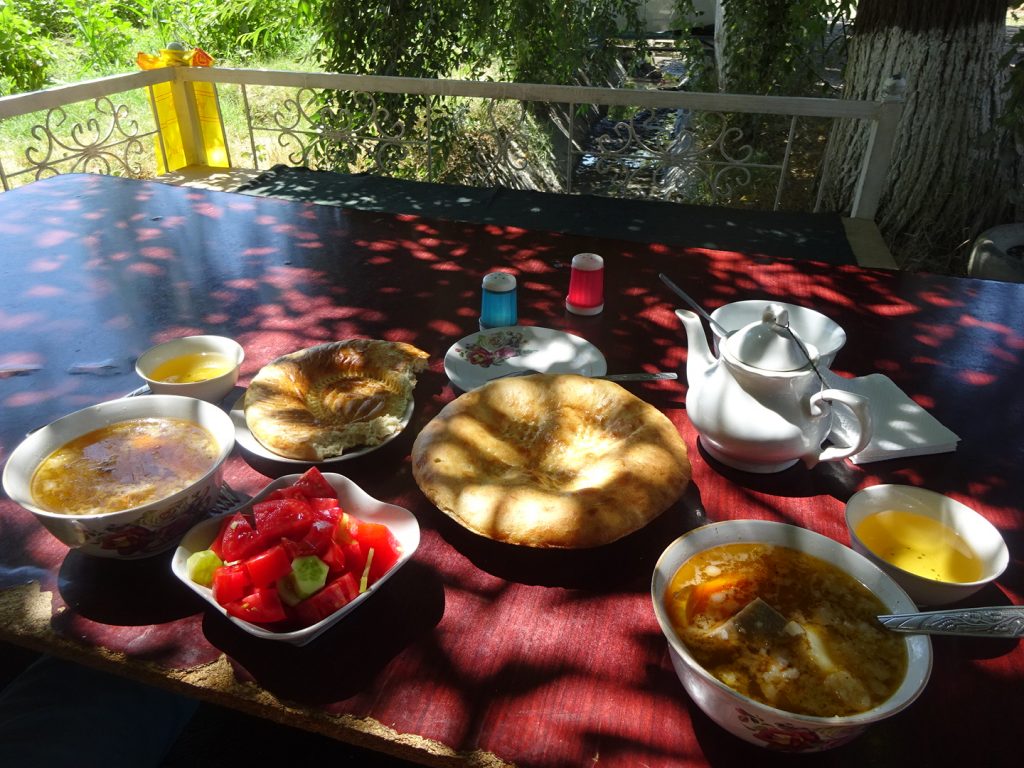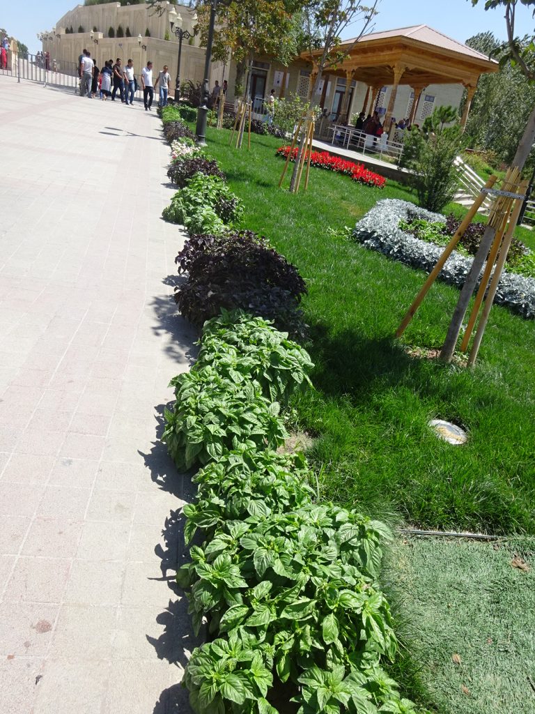 Kurzer Ausflug zur Ernährungslage: Zum Frühstück gibt es immer fettiges Spiegelei und Brot, mit Glück gibt es dazu noch Käse und immer grünen Tee, relativ geschmacklos.. ansonsten findet man fast nur einheimisches Essen, d.h. fettige Teigtaschen mit Hackfleisch (Somsa), Plov (Reis mit Gemüse und Fleisch, auch fettig, leider eher selten zu finden), Manti, oder auch Suppe (Fettbröckchen schwimmen herum, dazu eine große Kartoffel und ein Brocken Fleisch). Oder aber Kebab-Spieße (Gemüse und Fleisch). Als Beilagen oft Kartoffelpüree, Pommes (fettig und labbelig) oder Buchweizen. In den kleinen Cayhanas am Straßenrand gibt es meistens einfach die Suppe und Brot. Keine Diskussion :P. Ansonsten ist hier aber im Moment Weintraubensaison und die Trauben schmecken hier wirklich wunderbar. Die kann man auch oft zwischendurch am Straßenrand kaufen. Achja und Basilikum (lila und grün) ist in den Städten allseits beliebte Beetedekoration. Witzig.
