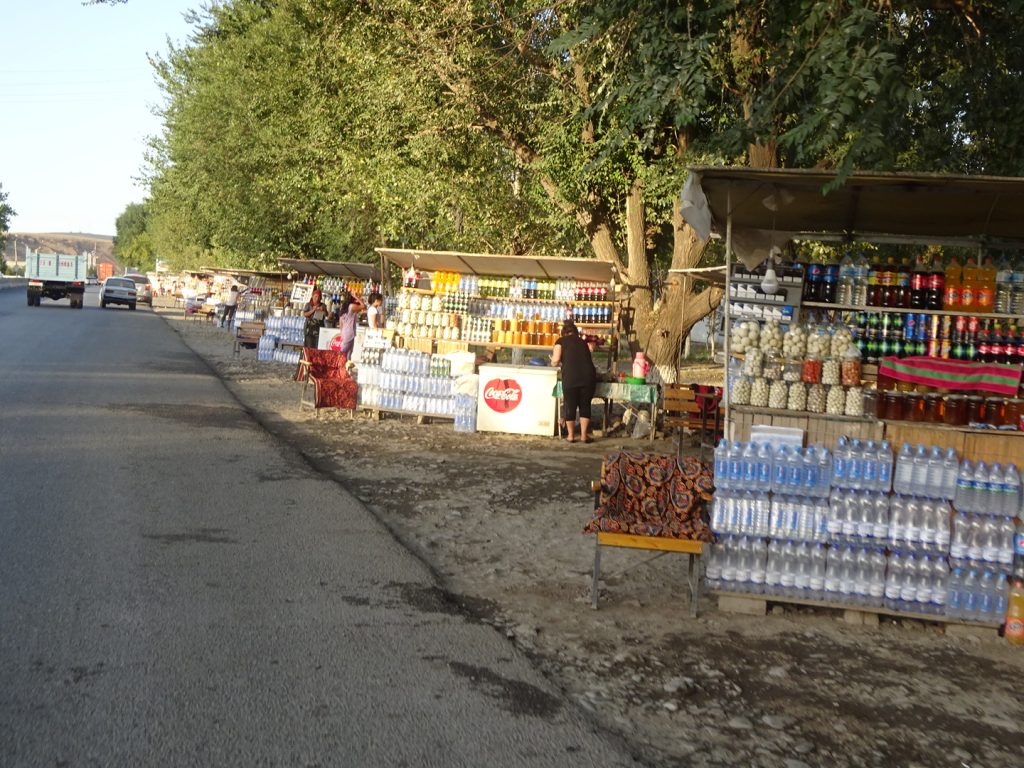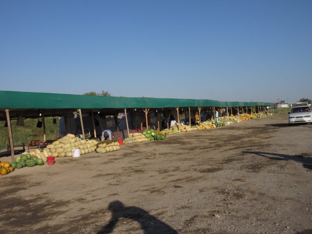 Die nächsten Tage stehen unter dem Motto „voran kommen“. Auf der Strecke nach Tashkent haben wir es auch ein paar mal mit betrunkenen Typen zu tun, wo bei mir dann gar keine Kommunkationsgelüste vorhanden sind. Auf der anderen Seite bekommen wir von einem Melonen-LKW-Mann eine riesige Galia/Honigmelone geschenkt und am gleichen Tag in einem Mini-Markt die Zwiebeln, die wir kaufen wollten. Die Frau guckt uns ein bisschen verzweifelt/lachend an „Fsjo??“ („nur die Zwiebeln??“) – „jaa :)“, Geste: hier, nimm, das brauche ich nicht zu kassieren ;D. Danke 🙂 Als wir bei den Rädern stehen und gerade losfahren wollen, kommt sie aus dem Laden und gibt uns noch jeweils eine kleine kalte Cola 🙂 Hmm lecker!!!