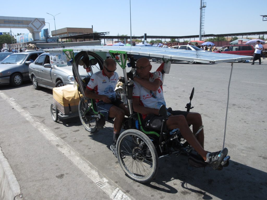 Weiter gehtˋs, raus aus Tashkent, die letzten Sum verbraten und auf zur Grenze, wieder nach Kasachstan. Hier werden wir wieder flott durchs Tor gelassen, sobald der Grenzsoldat uns sieht. Pass-Kontrolle, und wir müssen unsere Registrierungszettelchen vorlegen, wobei der Beamte wohl mit der Anzahl zufrieden ist und sich nur einen Zettel überhaupt näher anguckt. Zickzack sind wir dann auch schon in Kasachstan, wieder ein guter Grenzübergang.. Zusammen mit uns sind noch ein Haufen Solar-E-Bike Radler aus Frankreich, die mit einem der Grenzbeamten sogar ein Selfie machen sollen (da können wir nicht mithalten ;D).