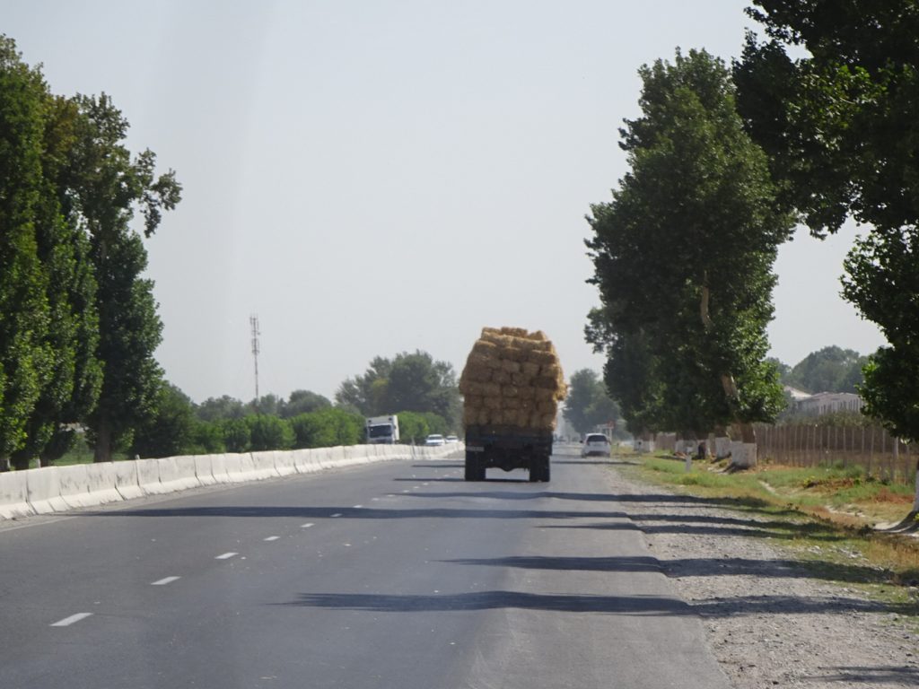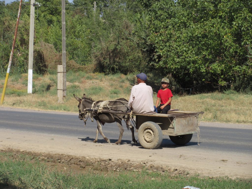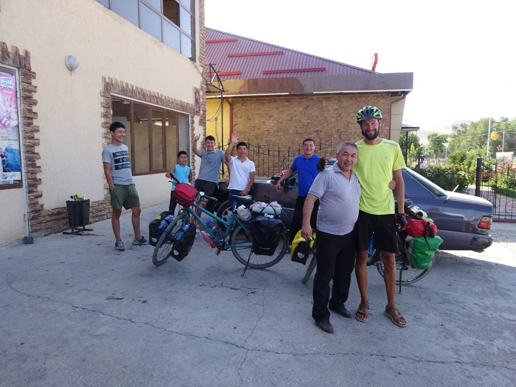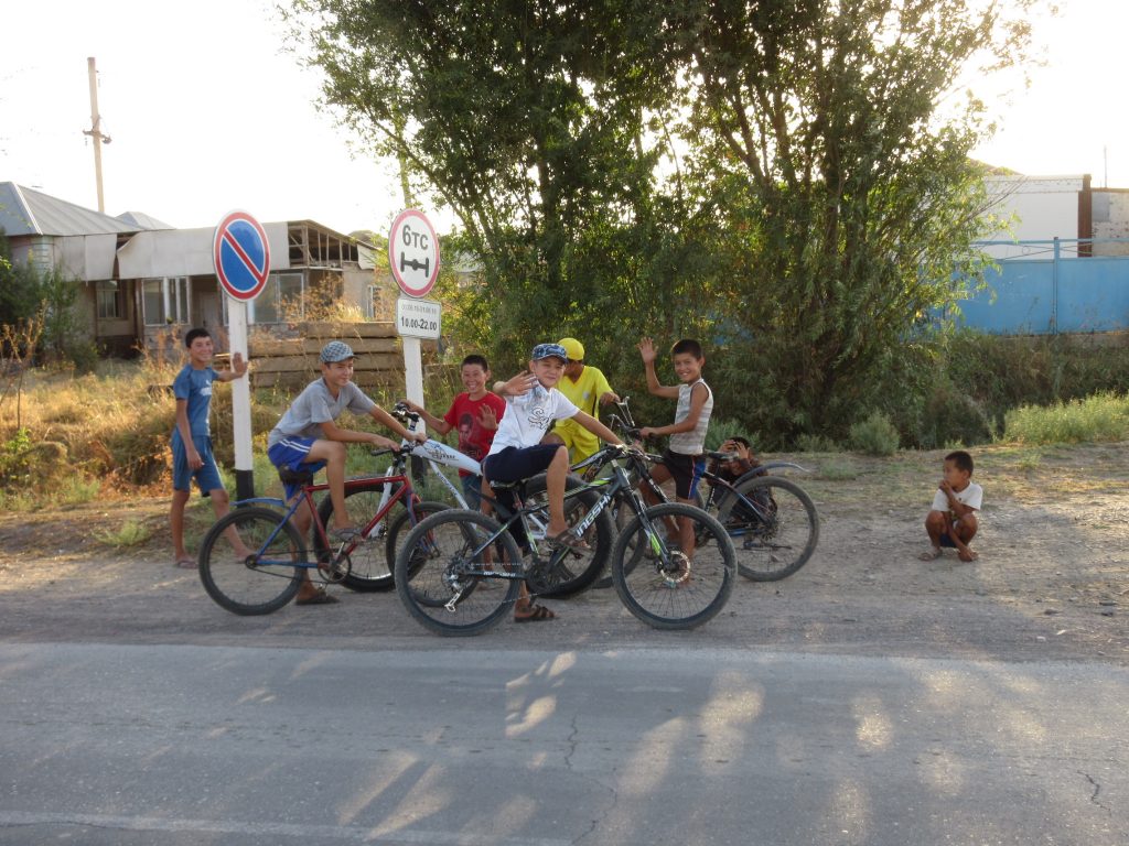 Das leichte Angenervt-Sein von Usbekistan und seinen Straßenverhältnissen hält an. Mit ordentlich Gegenwind strampeln wir aus Samarkand hinaus. Später geht es bergab und die Fahrt wird einfacher. Eine Family im Auto hält uns an, um mit uns ein Foto zu machen und zeigt uns stolz ein weiteres Foto mit einem Radler, dass sie letztes Jahr aufgenommen haben „Tradition, Tradition“ ^^. Nachdem sie unsere Route erfragt haben, übernimmt der Familienvater unsere Routenplanung. Nein nein, wir sollen nicht nach Kasachstan, sondern weiter in Usbekistan bleiben, dann nach Kirgistan fahren, dann nach Kasachstan und dann nach China.. „Ja klar, so machen wirˋs :D“.. Abends zelten wir ruhig gelegen an einer Apfelplantage.