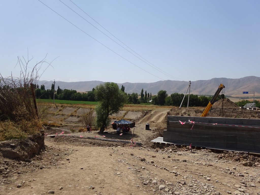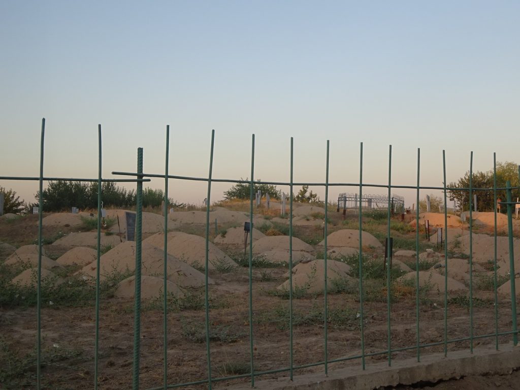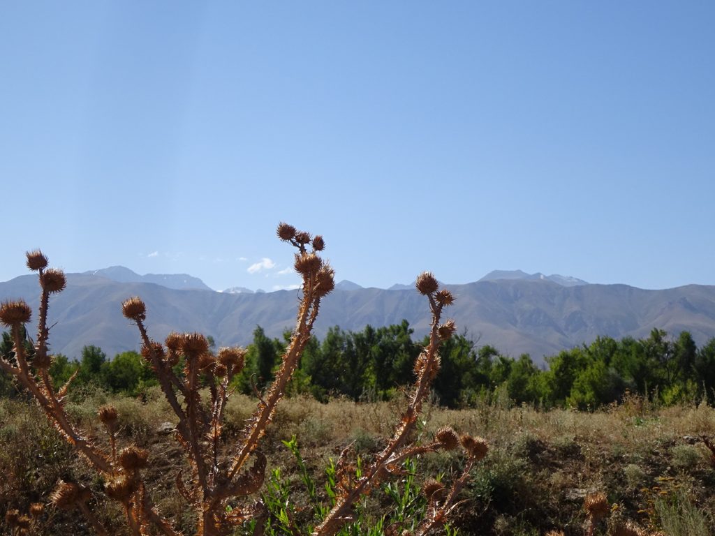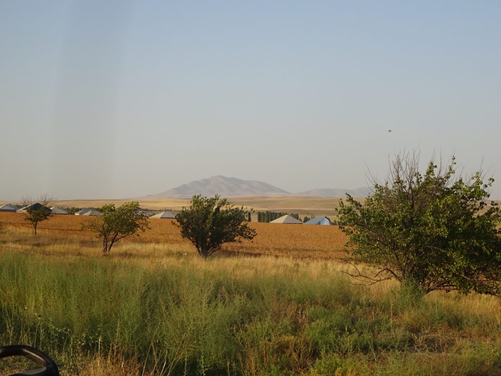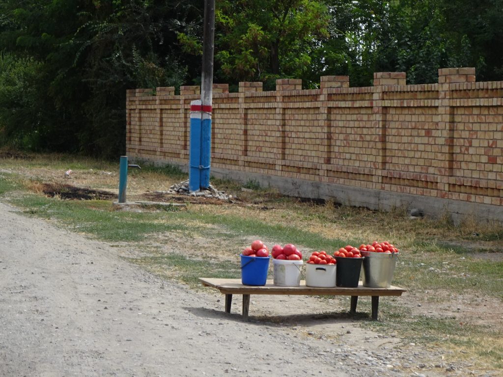Das leichte Angenervt-Sein von Usbekistan und seinen Straßenverhältnissen hält an. Mit ordentlich Gegenwind strampeln wir aus Samarkand hinaus. Später geht es bergab und die Fahrt wird einfacher. Eine Family im Auto hält uns an, um mit uns ein Foto zu machen und zeigt uns stolz ein weiteres Foto mit einem Radler, dass sie letztes Jahr aufgenommen haben „Tradition, Tradition“ ^^. Nachdem sie unsere Route erfragt haben, übernimmt der Familienvater unsere Routenplanung. Nein nein, wir sollen nicht nach Kasachstan, sondern weiter in Usbekistan bleiben, dann nach Kirgistan fahren, dann nach Kasachstan und dann nach China.. „Ja klar, so machen wirˋs :D“.. Abends zelten wir ruhig gelegen an einer Apfelplantage.