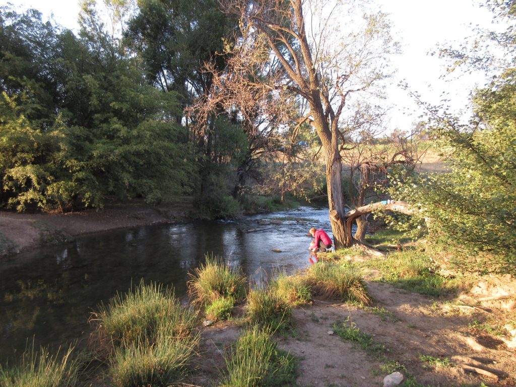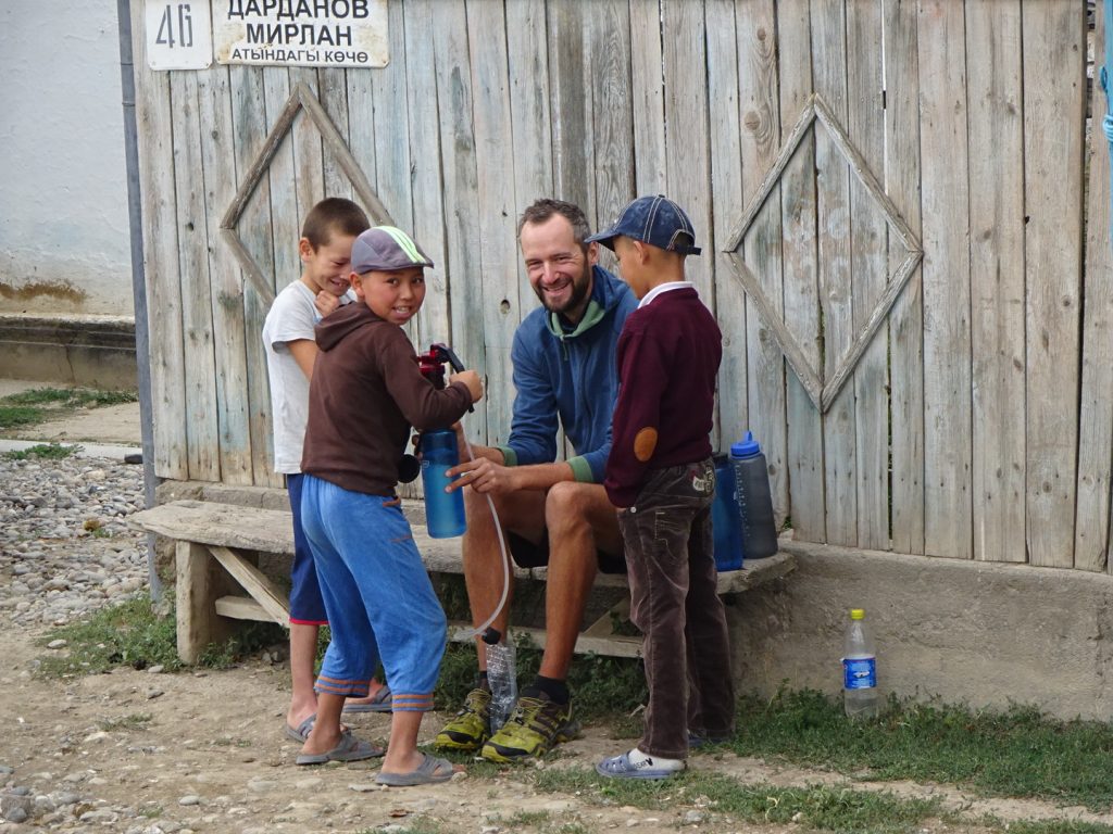 Am nächsten Morgen sind die Temperaturen ordentlich gesunken. So zwischen 10 und 15 °C. Im ersten kirgisischen Dorf entdecken wir blaue Wasserpumpen, hier bedienen wir uns auch. Gleich kommen Jungs herbei gelaufen, begrüßen Max mit Handschlag und nehmen ihm das Pumpen mit unsererm Filter ab. Dazu bekommen wir noch Äpfel geschenkt, Super 🙂
