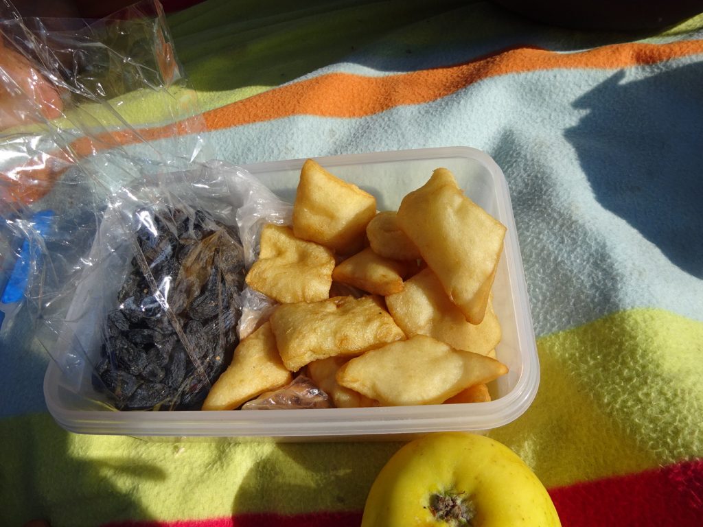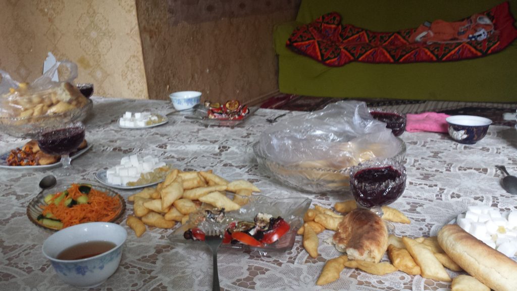 Zum Glück haben wir gerade eine Tafel Schokolade gekauft und können einen kleines Gehalt bezahlen 😉 Später am Tag werden wir zum Essen eingeladen und nehmen gerne an. Es gibt Unmengen Schmalzkuchen, dazu Marmelade, Salate mir ordentlich Knofi und Reis und natürlich Tee (endlich wieder Schwarztee :). Die Unterhaltung läuft in Teilen ganz gut. In dieser Region von Kirgistan haben wohl mal viele Deutsche gewohnt, wie uns die Frau des Hauses bterichtet. Das bebilderte Englisch-Schulbuch des Sohnes frischt die Unterhaltung noch ein bisschen auf. Als wir am frühen Abend am Straßenrand halten, pöbelt/schreit ein Typ auf der anderen Straßenseite und kommt zackig auf uns zu. Er macht ganz den Eindruck, als wollte er uns gleich eine Reinhauen.. ich mache schonmal einen Schritt rückwärts und Max streckt seine Hand aus „Hello“. Da geht dem (besoffenen, torkelt) Asi irgendwie merkbar die Luft raus und er motzt noch ein bisschen, zieht dann ab, wobei er mich fast aus dem Weg rammt.. Ich glaube, es war sehr gut, dass Max nicht auf russisch gegrüßt hat.. Glück gehabt. In einem Weidewald schlagen wir unser Zelt auf, wobei 2mal ein Reiter mit 2 Hunden vorbei schaut und dann weiterzieht.