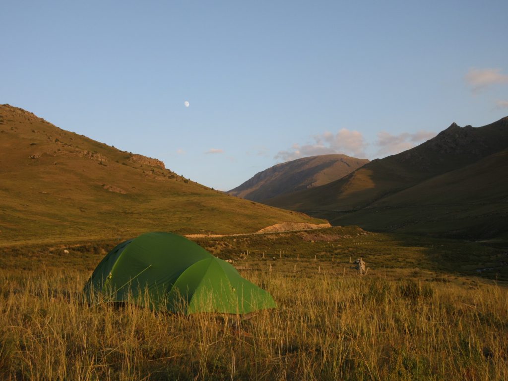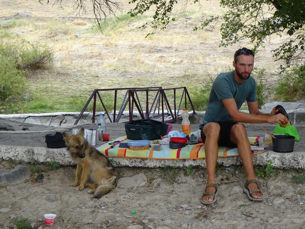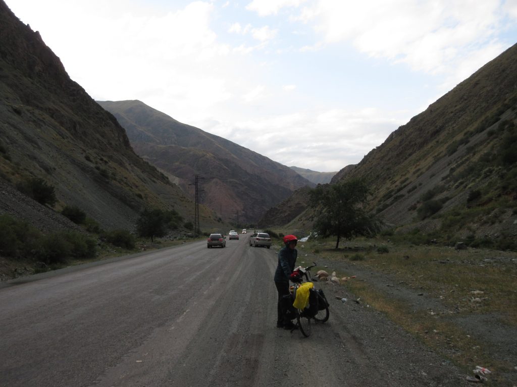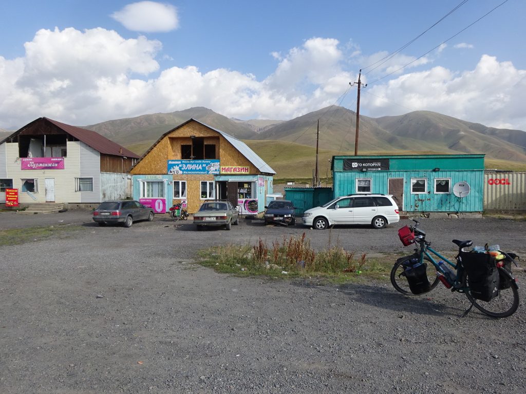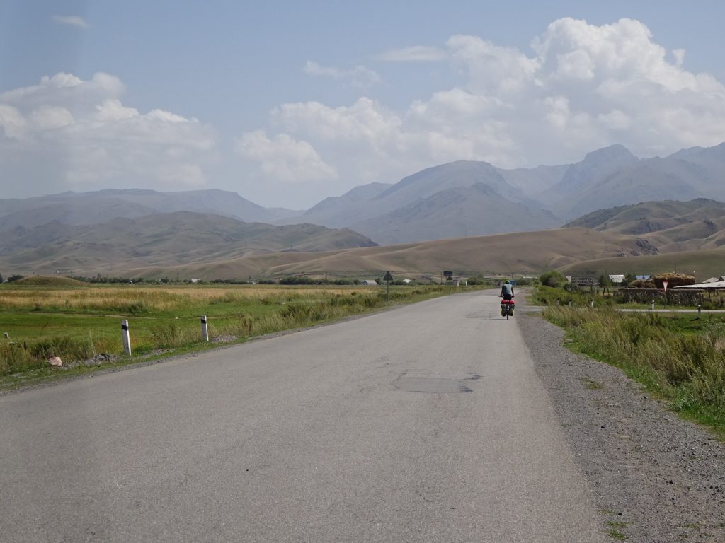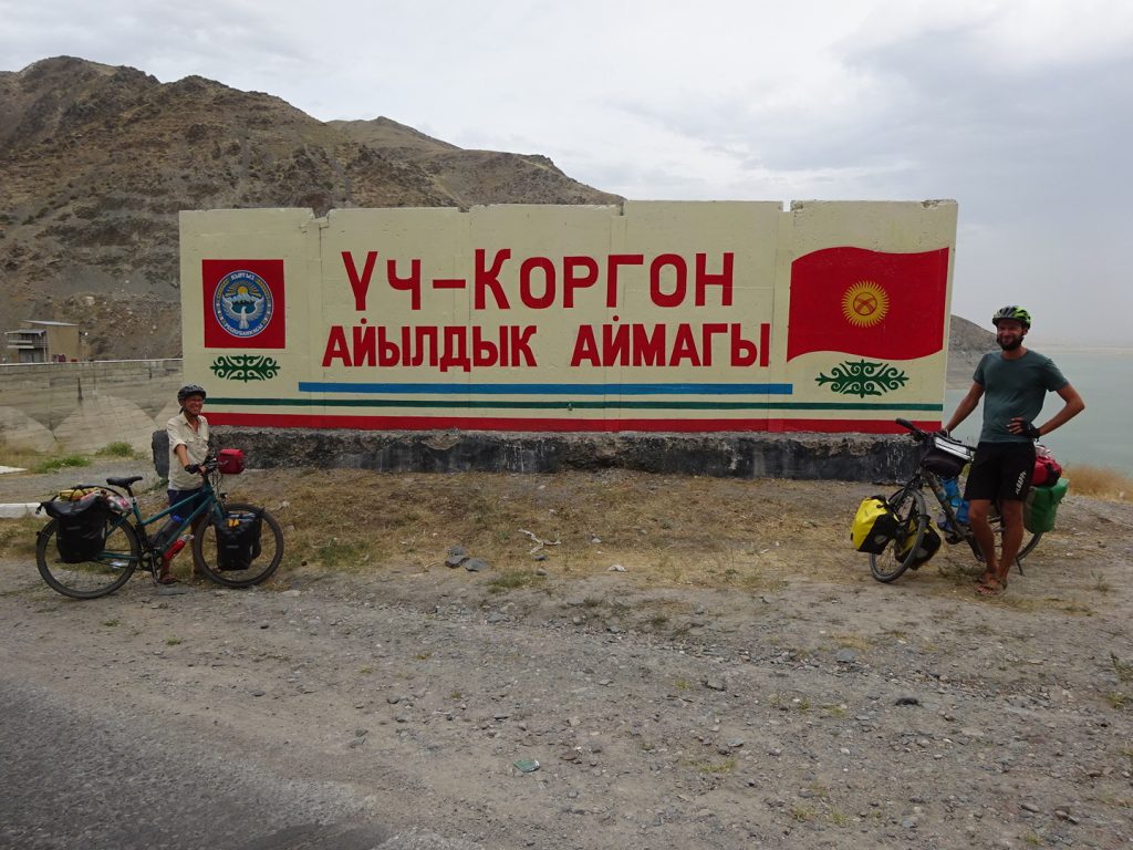 Am nächsten Morgen fahren wir dann ca. 16 km zur kirgisischen Grenze. Es wird direkt bergig und Wolken ziehen auf. Der Grenzübergang ist wieder easy, der kasachische Beamte wirft einen oberflächlisten Blick in einer unserer Taschen und ab geht´s. „Welcome to Kirgistan“ :). Im nächsten Dorf gibt es gleich einen Mini-Markt mit Kneipe und ATM innendrin, perfekt. Mit den Monopoly-Soms ausgerüstet reist es sich gleich entspannter 🙂 In der Mittagspause kochen wir dann endlich unsere Nudeln und bekommen nach langer Zeit mal wieder Gesellschaft eines netten Hundes. Später geht die Fahrt bergauf um einen See herum, die Landschaft hat sich total verändert und wir fahren staunend und happy die Straße entlang. Abends schlagen wir das Zelt an einer kleinen Sandpiste auf. Entspannt, ohne großes Tamtam. Max verschwindet sofort im Zelt, ich tüdel noch ein bisschen rum und folge dann. Die Regenplane ist aufgesetzt, wir lassen wie immer Belüftungsschlitze.. Es wird windig und die Plane flattert. OK, lass uns mal die Reißverschlüsse ganz zuziehen, das nervt ja sonst.. Jaa 😀 kurz darauf fängt es aber so richtig an zu stürmen, unser Vorzelt wird bedenklich ins Hauptzelt reingebogen, da müssen wir das Gestänge mit Kraft festhalten, damit es nicht bricht.. dabei wird uns der Staub ins Zelt und ins Gesicht gewirbelt. Das Zelt steht auch noch komplett falsch herum im Sturm und ist so exta angreifbar.. Gut, es hilft nichts. Klamotten wieder an und raus da.. zum Glück regnet es nicht.. Im wirklich krassesten Sturm drehen wir das Zelt in die richtige Richtung und schnüren es mit allen erdenklichen Kordeln fest.. das dauert und ist nicht allzu einfach.. dann ist es aber geschafft, die Räder legen wir auch hin, versuchen unser Zelt zu entstauben und werfen uns wieder hinein. Der Sturm lässt dann zum Glück auch wieder nach, später in der Nacht regnet es noch.. „Welcome to Kirgistan“ ^^.