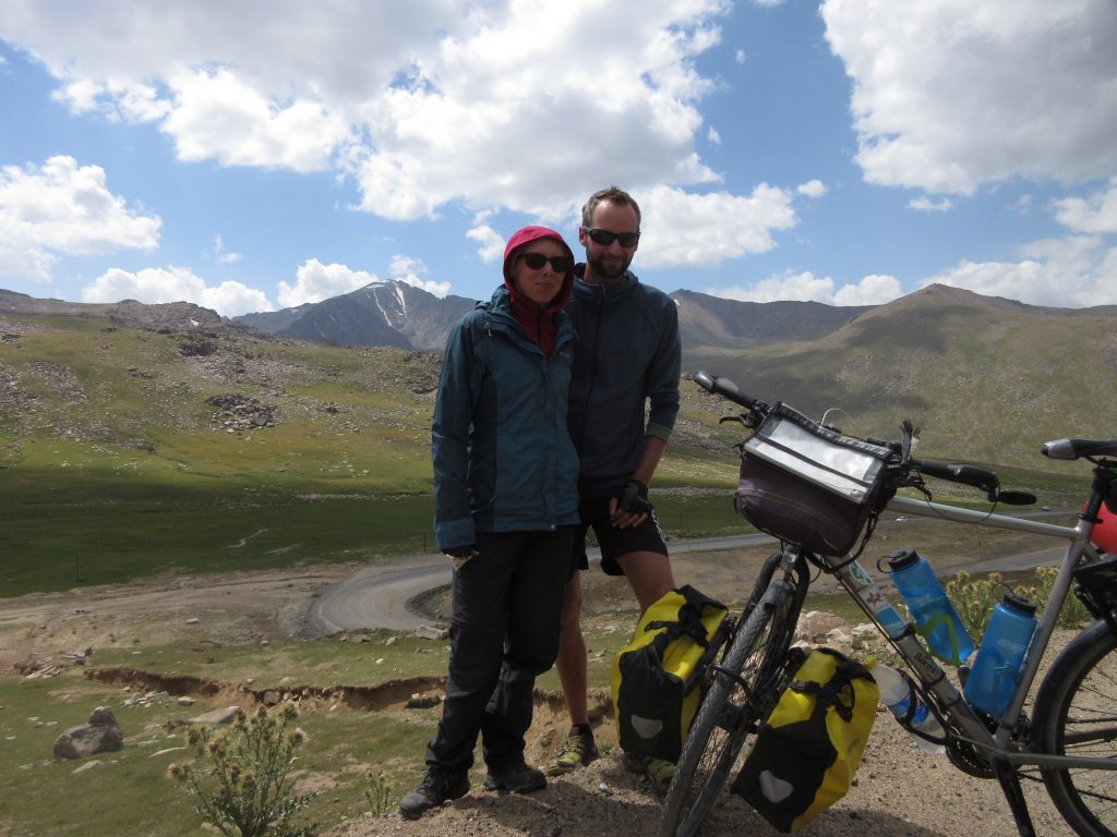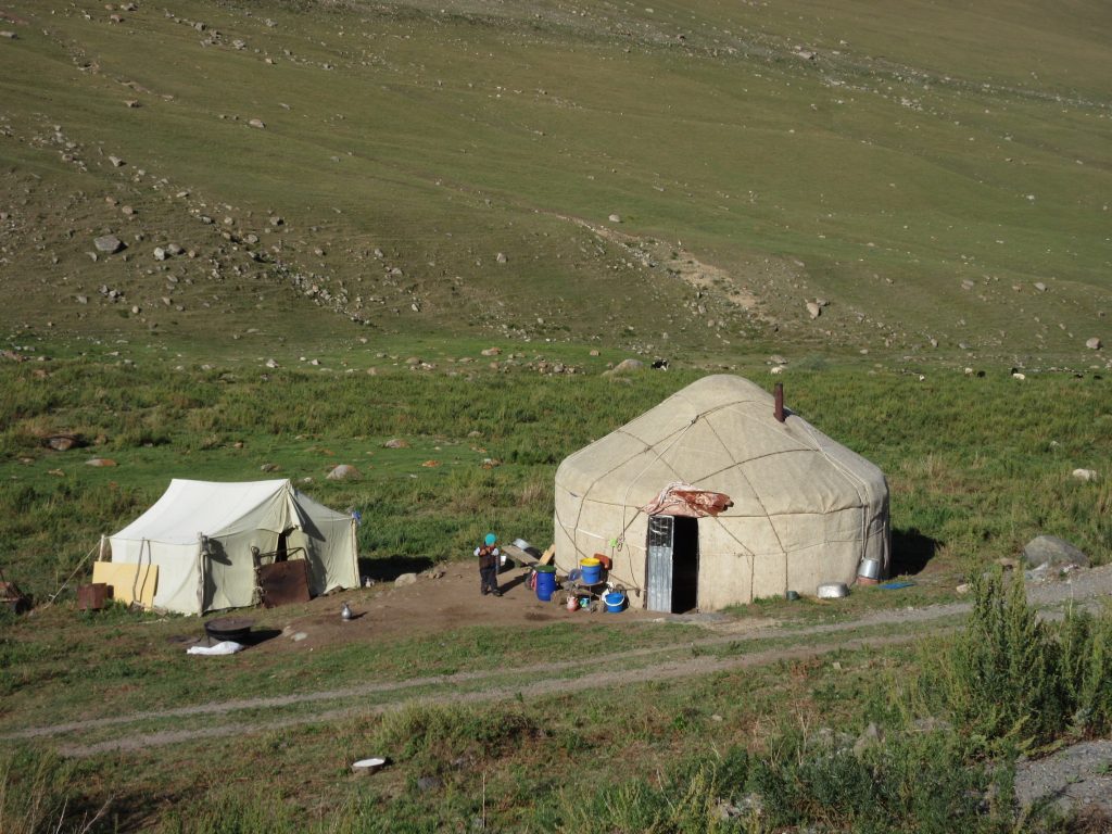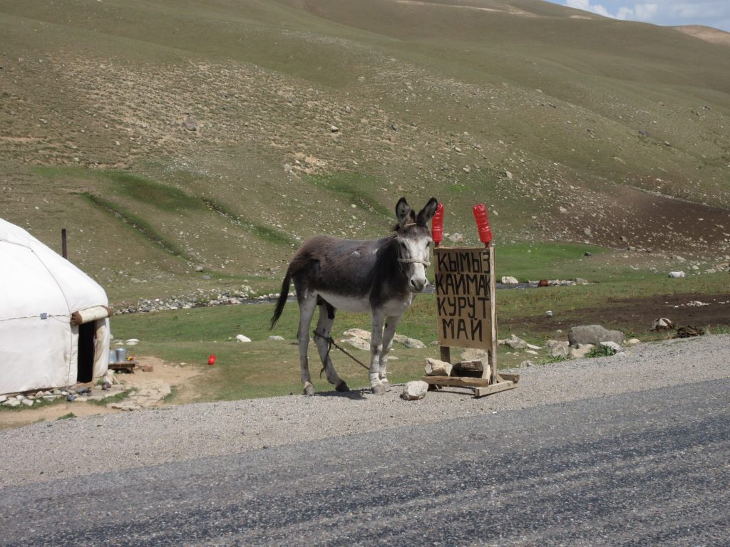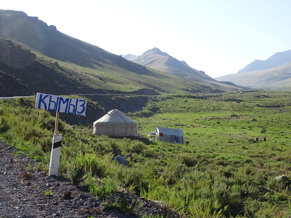 Am nächsten Morgen habe ich schon gar keine Lust los zu „fahren“. Es geht anstrengend bergauf. 1000 Höhenmeter in ca. 14 km.. für mich heißt es da mal wieder schieben und ein bisschen strampeln und viele Pause einlegen. Reine „Fahrzeit“ sind 3 h, dazu kommen noch diverse Pausen und so sind wir erst 14 Uhr auf der Spitze angekommen. Frisch ist es mal wieder, es gibt ein Gipfel-Snickers und dann folgen 14 km Abfahrt auf ca. 2500m. Unten angekommen sehen wir ein Teehaus. Rein da 🙂 Tee, Gulasch und Manti, danach sind wir wieder hergestellt. Zwei Typen kommen rein, beglupschen uns neugierig, kaufen sich ne Buddel Wodka und laden uns zu sich ein. Das Standardgespräch beginnt, wobei Max wohl 3-4 kleine Gläschen kippt, ich nach dem 2. vehement ablehne und verschont bleibe^^. Der eine quatscht mich etwas aufdringlich voll und so wird es Zeit weiter zu fahren.. Kaum sind wir draußen bei den Rädern, da kommt der nächste Typ vorbei. „Come, come“. Auf der anderen Straßenseite steht ein Van mit offenem Kofferraum, darin Fettgebäck, Wodka und Rindfleisch. Zack haben wir die nächsten Becher in der Hand, diesmal aber 0.2 L Plastikbecher gut 2-3 Fingerbreit voll mit Wodka. Runter damit und zwar nicht in kleinen Schlückchen. Danach wird das Rindfleisch gemampft und dann ein Schluck Fanta getrunken. So steht man da und bräuchte eigentlich 3 Hände, um all die Dinge in der richtigen Reihenfolge zu jonglieren :D. Und dann gibts gleich die nächste Runde, man müsste mit Freunden mindestens 4 Wodka trinken lautet die Erklärung… gut gut nun ist aber Schluss :)! Fotosession und dann fahren wir weiter. Die beiden Typen aus dem Teehaus haben ihre Wodkaflasche geleert und fahren nun per Jeep selber weiter. Wir lassen ihnen mal einen guten Vorsprung..mit gefühlten 2 Promille und echten 30 km/h (bergab-Rückenwind-Kombi) fahren wir beschwingt weiter und schaffen doch noch 67 km insgesamt. Zelten hinter Jurten (runde Zelte) am Fluss. Auf der Strecke stehen überall die Jurten, z.T. mit Solarpanels. Hier wohnen die Hüter der Pferdeherden und produzieren fleißig Küemües (fermentierte Stutenmilch).
