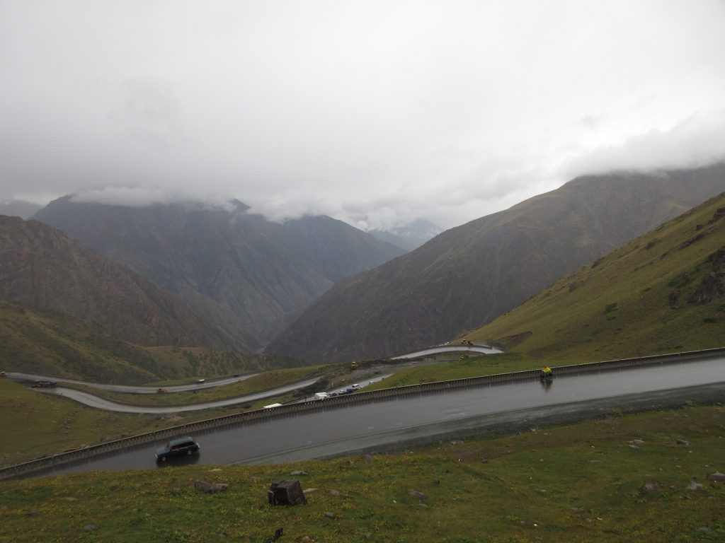 Am nächsten Tag geht es erst noch ein paar Kilometer chillig bergab, aber dann wartet der nächste Pass auf uns. Wieder müssen wir auf über 3000m hoch, diesmal aber etwas weniger Höhenmeter als beim ersten Mal, die Steigung ist auch ok, sodass ich den Großteil der Stecke auch strampeln kann.. allerdings fängt es immer mal wieder an zu regnen und wir pellen bestimmt 5 mal die Regenmontur an und dann wieder aus, weil es doch zu warm ist, sobald der Regen aufhört. Beim letzten Mal behalten wir allerdings alles an, es schüttet kräftig und wird richtig kalt. Oben gibt es kein schönes Schild, nur einen garstigen Tunnel aus dem die Abgaswolken wabern. Luft anhalten und durch da. Für LKWs gibt es eine Ampel, so dass immer nur in einer Richtung LKWs durch den Tunnel rauschen. Zum Glück geht es leicht bergab, sodass wir nicht zu tief atmen müssen. Auf der anderen Seite empfängt uns eisiger Regen, von der Tunneldurchquerung haben wir Rußspuren im Gesicht. Es sind wohl 2-3°C, wir sind schon nicht mehr ganz trocken, und nun beginnt die Abfahrt. Die Füße frieren ab, die Hände verkrampfen sich um die Bremsen. Ein Temperatur- und Körpergefühlsmäßiger Tiefpunkt. Allerdings, je tiefer wir kommen (und die Abfahrt scheint kein Ende nehmen zu wollen), wird es ja auch wieder wärmer. Wir hoffen auf ein weiteres Teehaus, aber Pustekuchen. Also werfen wir uns bei nächster Gelgenheit an den Straßenrand und packen den Kocher aus. Tee und Kaffee und die Nudeln von vorgestern aufwärmen, der Regen hat zum Glück wieder aufgehört. Nach der warmen Mahlzeit fühlen wir uns fast wie neu und setzen den bergab Weg durch violette Felsmassive fort. Finden abends einen malerischen Zeltplatz. Sobald wir im Schlafsack liegen glüht der Körper irgendwie nochmal nach, um den Frostschock zu verarbeiten und am nächsten Morgen kann man sich nochmal ne schöne Portion Ruß aus den Augenwinkeln porkeln ^^