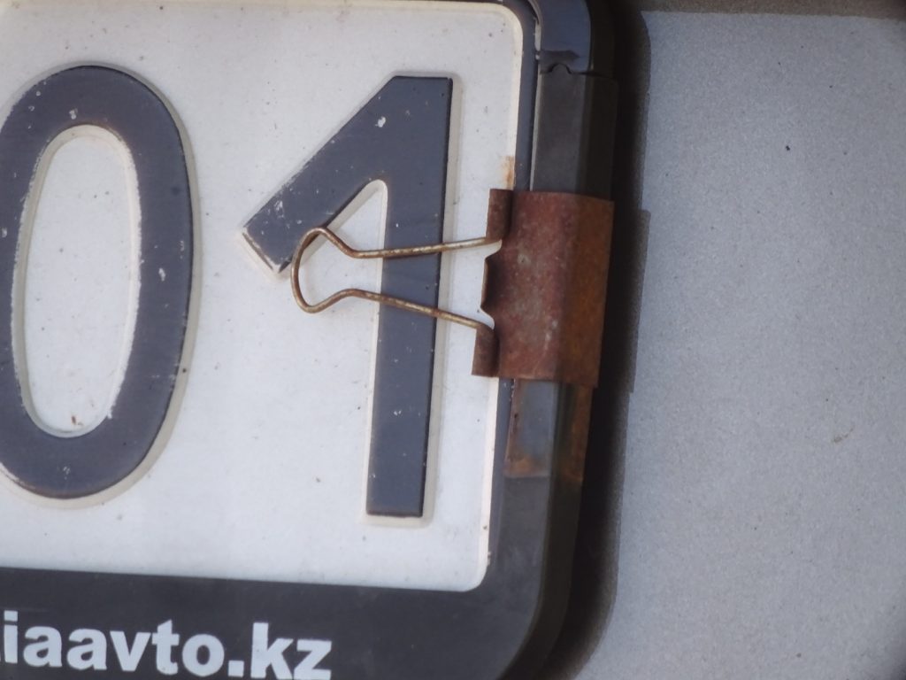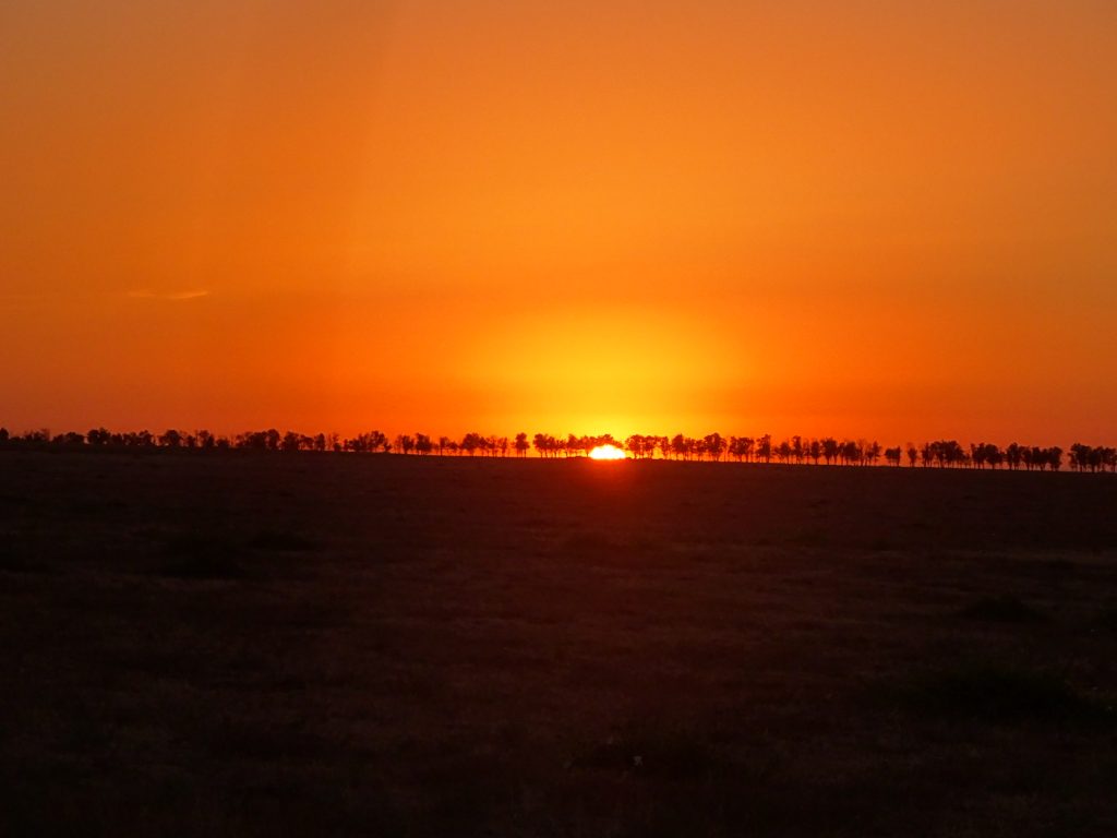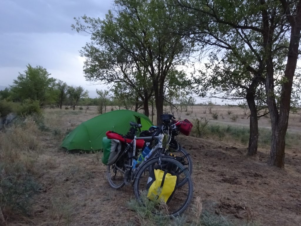 Ach wie schön ist Kasachstan 😉 Ich freue mich richtig. Die Läden haben wieder mehr Auswahl zu bieten, es stehen die Preise an den Artikeln und endlich können wir Geld wieder ganz einfach fernab von Banköffnungszeiten am Automaten abheben, ohne Vorlage eines Passes! Auch öffentliche Mülleimer muss man nicht mehr vergeblich suchen.. Später am Tag beginnt allerdings wieder der kasachische Gegenwind und es wird steppig. Nach 65 km finden wir hinter einem Dorf auf einer weitläufigen Weidelandschaft unseren Zeltplatz.