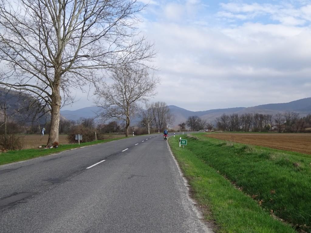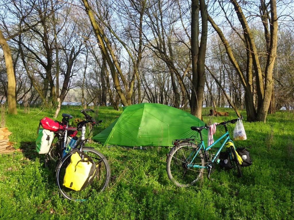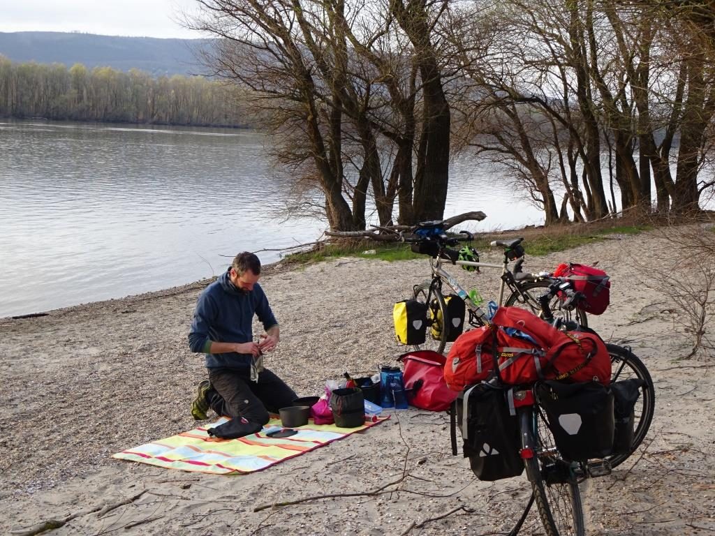 Dann geht’s weiter gemütlich die Donau entlang, es ist zwar bewölkt, aber nicht wirklich kalt. Kurze Sportpause 😉 und dann suchen wir uns erstmal einen Geldautomaten. Gerne hätten wir noch die Donau-Seite gewechselt, aber auch der Fährbetrieb ist jetzt noch nicht so in vollem Gange.. bei Visegrad machen wir eine Pause und essen „Sponge Cake“ und Spaghetti-Kuchen. Dann fahren wir bis zum „Donauknie“ (eine Insel in der Donau) und übernachten da auf einem bisher noch geschlossenen Campingplatz = Wald 😉
