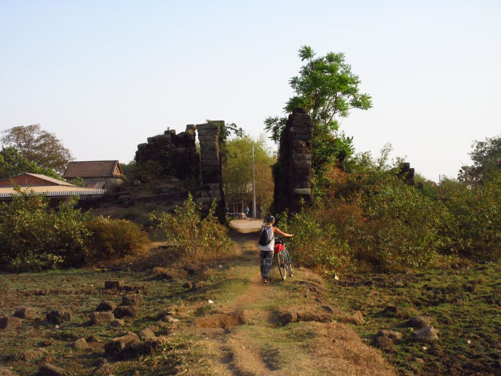 Unser Radfahren die nächsten Tage ist nur zielorientiert (nicht: der Weg ist das Ziel). Kambodscha ist nicht so groß und bis nach Siem Reap sind es ab der Grenze nur 420 km. Das Land ähnelt Laos, die Versorgungslage ist aber besser^^ Die „Eingänge“ zu Abzweigungen auf Nebenstraßen sind oft sehr kunstvoll verziert, die Gegend ist absolut flach und wir sehen (trotz Trockenzeit) einige Teiche und Tümpel mit Lotusblumen.