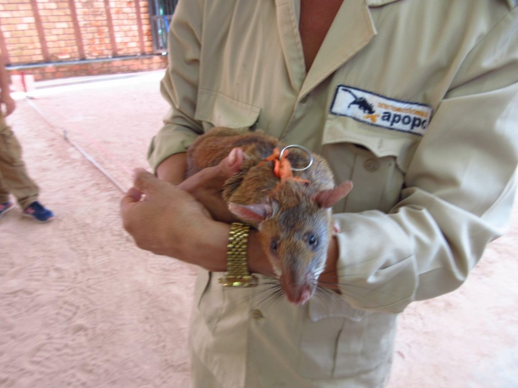 Dann haben wir noch ein Minenräumungscenter (APOPO visitor center) besucht. Auch Kambodscha wurde im Rahmen des Vietnamkriegs bebombt und diese und auch Minenüberreste von Grenzstreitigkeiten mit Thailand liegen nun noch unter der Erde. Die APOPO Organisation setzt spezielle Ratten aus Tansania ein, die Sprengstoff erschnüffeln können. Eine Ratte sucht eine bestimmte Fläche 5 mal schneller, effizienter und sicherer ab, als ein Mensch mit Metalldetektor. Zudem sind die Ratten leicht (bis 1.5 kg) und können so die Sprengkörper selber nicht auslösen. Hat die Ratte etwas erschnüffelt, fängt sie an zu graben und bekommt eine Belohnung (Erdnüsse oder Bananen). Hier ein paar Fotos und ein Demonstrationsvideo 🙂