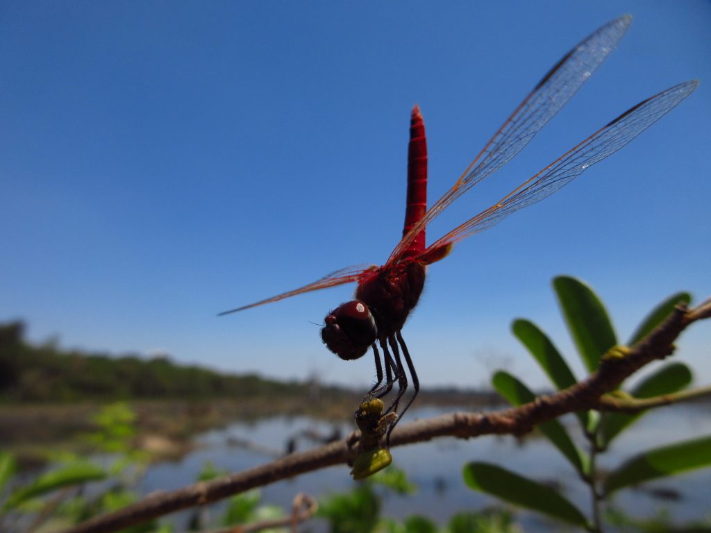 Gegen Abend wollen wir dann campen und fahren mal auf so ein vertrocknetes Reisfeld, (Sichtschutz zur Straße gibt es nicht so wirklich..) aus einigen Hütten kommt sehr laute Musik, wir gehen immer weiter, bis wir eine einigermaßen ruhige Stelle gefunden haben und bauen das Zelt auf. Gerade wollen wir noch ein bisschen Brot (noch aus einem Supermarkt in HCMC) essen, da kommt eine Delegation von 2 Männern (1 alt, 1 jung) und 2 Frauen (2 mittelalt). Der Alte grüßt und sagt dann gleich „no camping“, „snakes“ (ja sicher, deswegen latscht ihr hier im Dunkeln in Flipflops rum..), zeigt ein Foto auf seinem Phone (er in Polizeiuniform)..Ja super… Ich bin super angenervt, wollte schon seit 4 Uhr am liebsten nur noch schlafen und nun das.. Also bauen wir das Zelt und packen alles wieder zusammen, zwischendurch verlangt der Alte noch ein Foto von uns beiden zu machen.. Für die Akte oder den Privatgebrauch?? Nervig. Dann eskortieren sie uns durch einen Trampelpfad im Gebüsch, dahinter mehrere Häuser und im Garten des Polizisten schon ein kleiner Menschenauflauf. Kurz darauf kommt der nächste Polizist angefahren, er kann gut englisch sprechen, entschuldigt sich für die „Unannehmlichkeit“ und erklärt, dass es gefährlich wäre hier zu campen, man könnte bestohlen werden.. hmm jaaa..dann kommen unsere Optionen: Guesthouse (noch ca. 10 km enfternt), oder „my office“ (nicht so weit). Wir entscheiden uns für „my office“ und folgen dem Polizisten auf seinem Roller. Im Dunkeln rumpeln wir kreuz und quer über kleine Staubfeldwege und dann noch ein Stück auf der normalen Straße, dann sind wir da. Eine Baustelle von Polizeistation, keines der Häuser hat eine Tür, oder Fenster, 2 Hunde und einige Hühner laufen rum. Hinter dem Haus ist aber ein guter Platz für unser Zelt 🙂 Unser Polizist fährt nochmal los und kauft Wasserfläschchen, dann unterhalten wir uns noch ein bisschen. Dann fährt noch ein Auto vor und zwei weitere Polizisten steigen aus. Wir grüßen freundlich, sie nicht, sie glupschen vornehmlich und wirken sehr unfreundlich. Zum Glück ist unser Englischpolizist (Piseth) ihr Boss und nicht anders herum… Der Alte, der uns aufgegabelt hatte, verlangt per Telefon noch unsere Pässe zu sehen, also gut. Dann gehen wir schlafen, die Nacht ist eher unruhig und von Hundegebell, Hahnengeschrei (ca. 3 Uhr) und ab 5 Uhr von Lautsprecher Kakophonie (Musik und Gelaber aus verschiedenen lauten Quellen) unterbrochen.