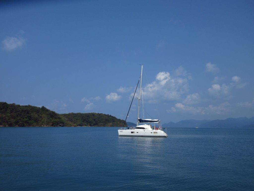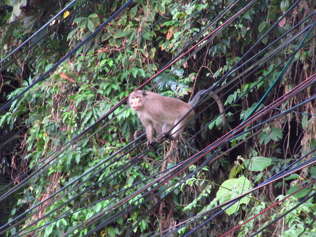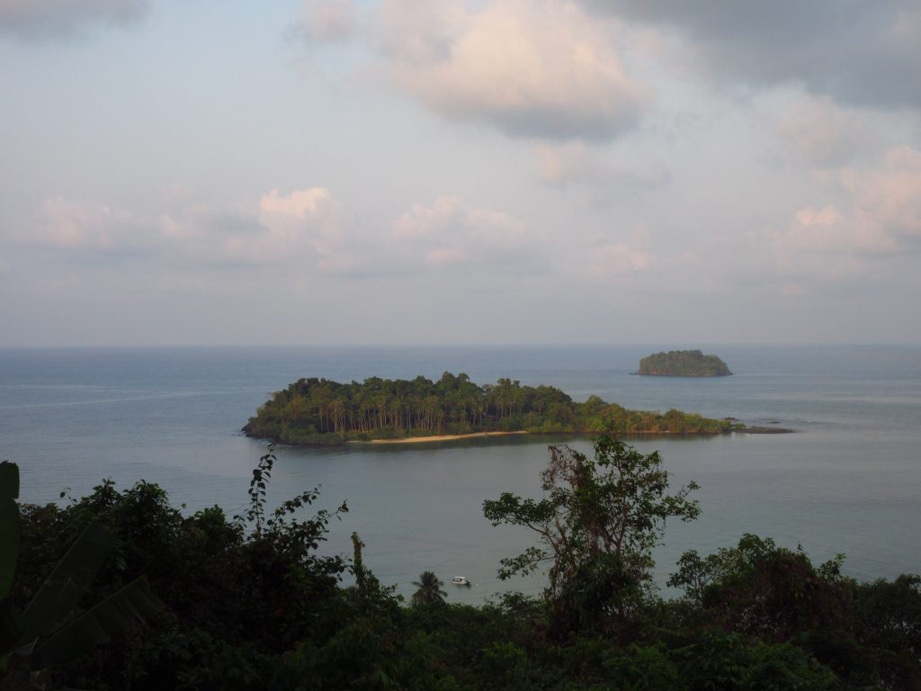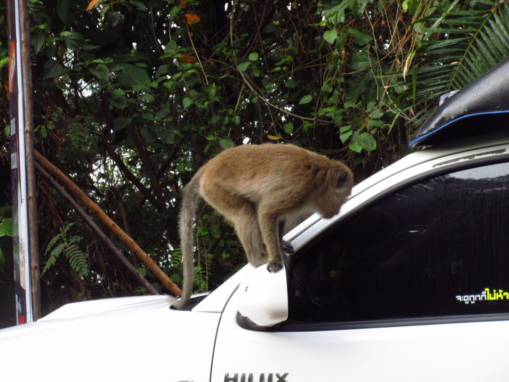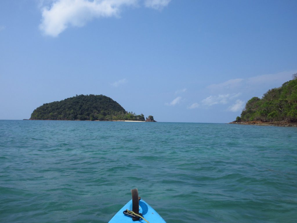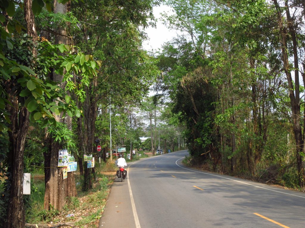 Heute fahren wir zur Insel Koh Chang. Wie jeden Tag ist es unheimlich heiß.. wir gurken gute 50 km bis zur Fähre, sinnlose riesige Autos verstopfen die Autofähre, vor einigen Jahren haben bestimmt noch doppelt so viele Autos auf die Fähre gepasst.. Auf Koh Chang erleben wir dann eine neue Form des bergauf-astens..Es gibt kleinere Hügel auf dieser Insel (ca. 100 bis 150m), allerdings führt die Straße quasi direkt nach oben und die Steigung beträgt zumeist um die 20%..in Kurven hatte man eher das Gefühl, man könnte sein Rad auch gleich senkrecht hochheben.. so intensiv haben wir die Räder bisher noch keine Berge hochgeschoben 😀 Aber das macht ja nichts, es sind ja nur 8 km (davon auch ein Teil gruselige Bergabfahrt) und dann sind wir in unserer Unterkunft angekommen. Die Insel selber hat uns nicht gut gefallen und deshalb beschließen wir, auf eine kleinere Insel (Koh Mak) überzusetzen.. ein bisschen Diskussion gab’s wegen der Räder, aber dann ist die Sache geritzt 🙂 Abfahrt des Boots am nächsten Morgen um 9 Uhr, der Pier ist ca. 16 km entfernt und wir planen aufgrund des Höhenprofils 3 h für die Fahrt ein und brechen um 6 Uhr auf. Gegen kurz nach 8:00 sind wir dann tatsächlich da, unterwegs haben uns viele Äffchen von den Stromleitungen aus beobachtet, wie wir keuchend unsere Räder schieben..