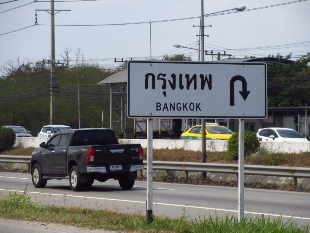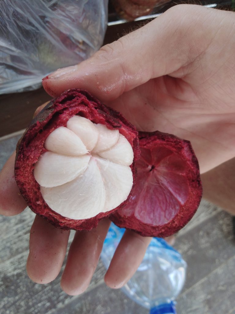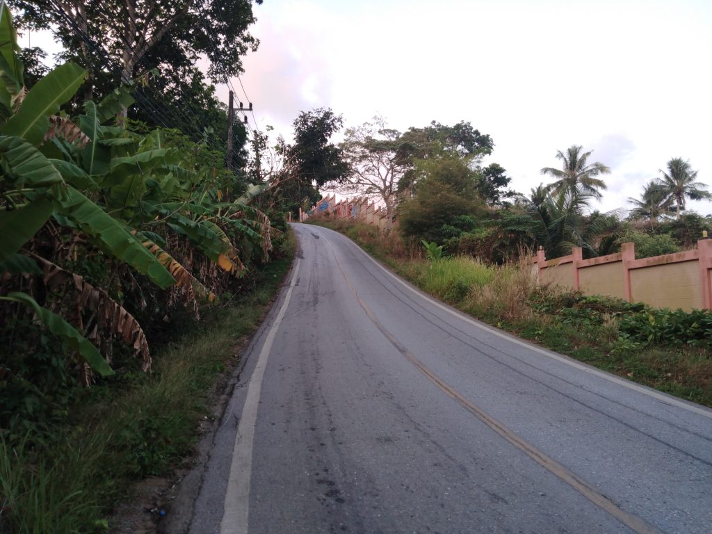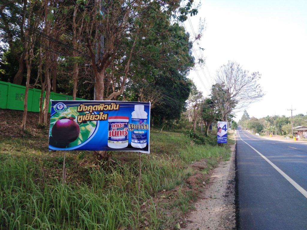 Hinter der Grenze kommt uns ein Polizeiroller auf unserer Seite entgegen, wir wundern uns da nicht mehr.. Bis Max dann bemerkt, dass hier Linksverkehr herrscht 😀 hupsi^^ Die Landschaft ist nun deutlich grüner, Plantagen von Ananas, Mangosteen, Durian & Gummibäumen wechseln sich ab, dazwischen immer wieder Wahlplakate und Pestizidwerbung..