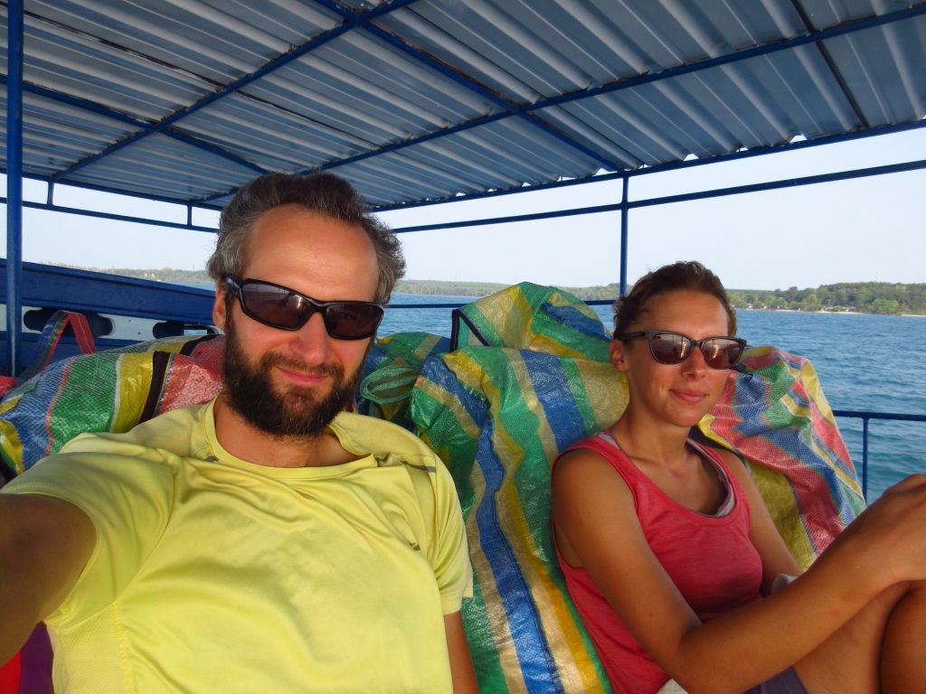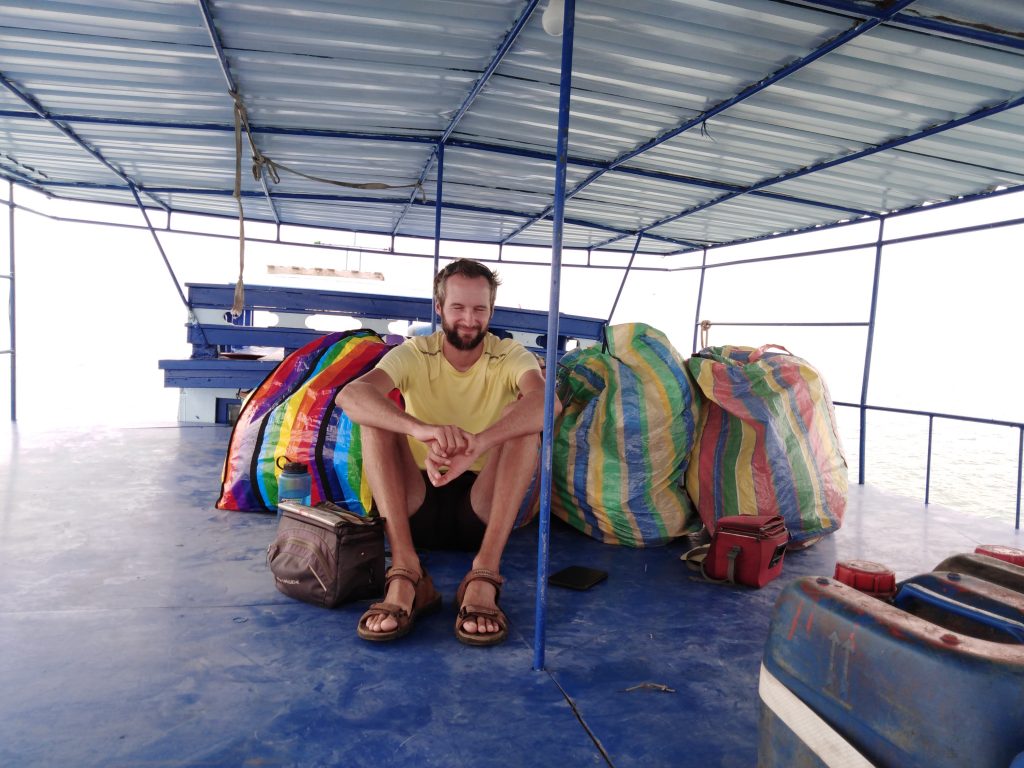 Von der Insel zum Festland fahren wir mit einem Transport-Boot ohne Sitzplätze, allerdings können wir uns bequem an Berge von Tüten gefüllt mit Handtüchern lehnen 😀