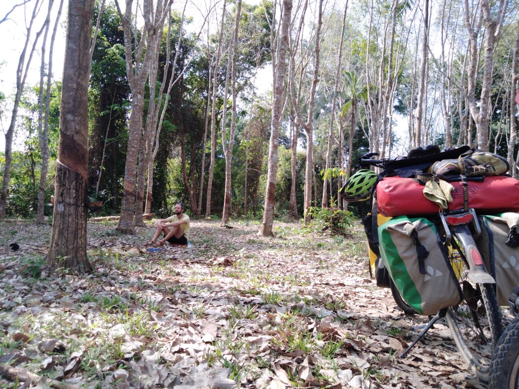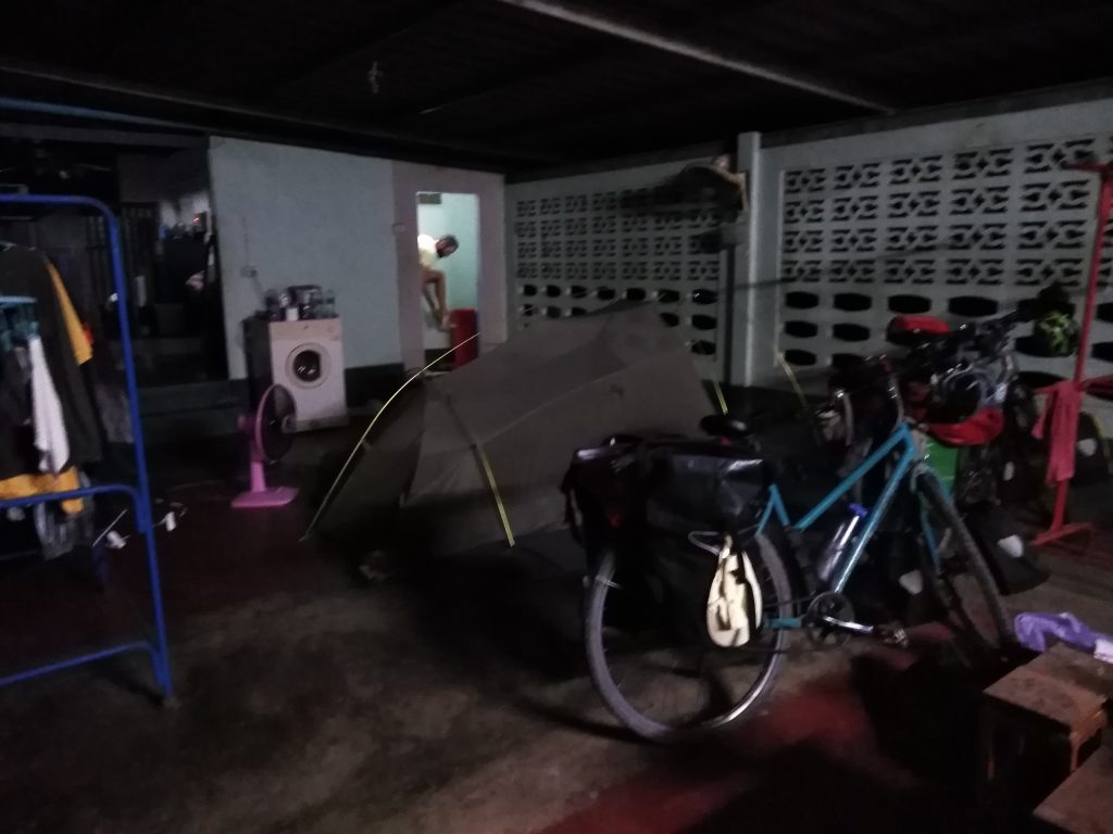 Wir fahren und fahren, machen hin und wieder eine Kaffee oder Futterpause..Gegen Abend suchen wir eine Art Guesthouse, so etwas gibt es hier aber nicht, und dann beschließen wir, vielleicht einfach in einer der Plantagen zu übernachten..Also halten wir kurzerhand vor einem der Häuser, um uns die Campingerlaubnis einzuholen.. Ein Mann steht etwas verwirrt vor uns, ruft gleich seine Schwester an, wir hören „falang“ (wie in Laos – Ausländer), dann reicht er das Handy an Max weiter, die Schwester spricht englisch. Nach einigem hin und her des Handys dürfen wir in einer Art Garage oder Abstellraum übernachten, mit eigenem Plumpsklo 🙂 Der Mann fängt sogar noch an Staub zu saugen, putzt das Bad und stellt uns noch Snacks und Getränke hin.. supernett 🙂