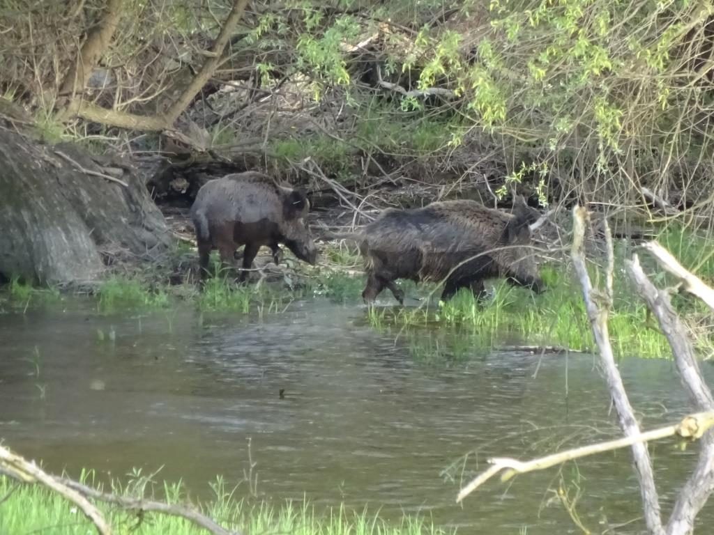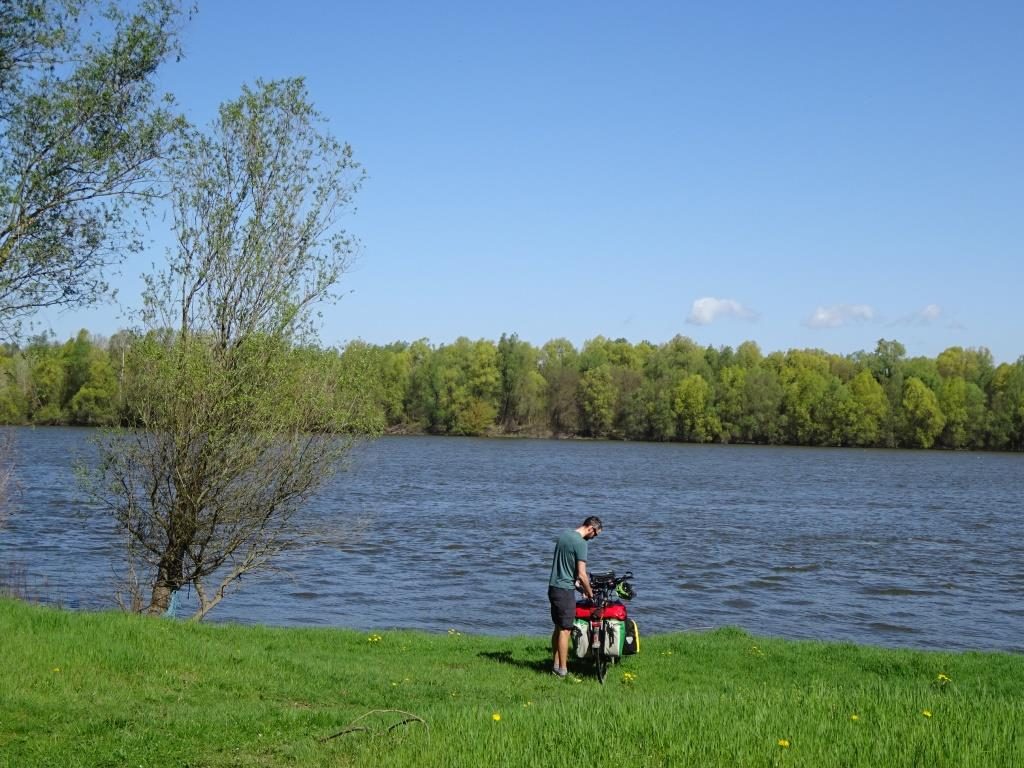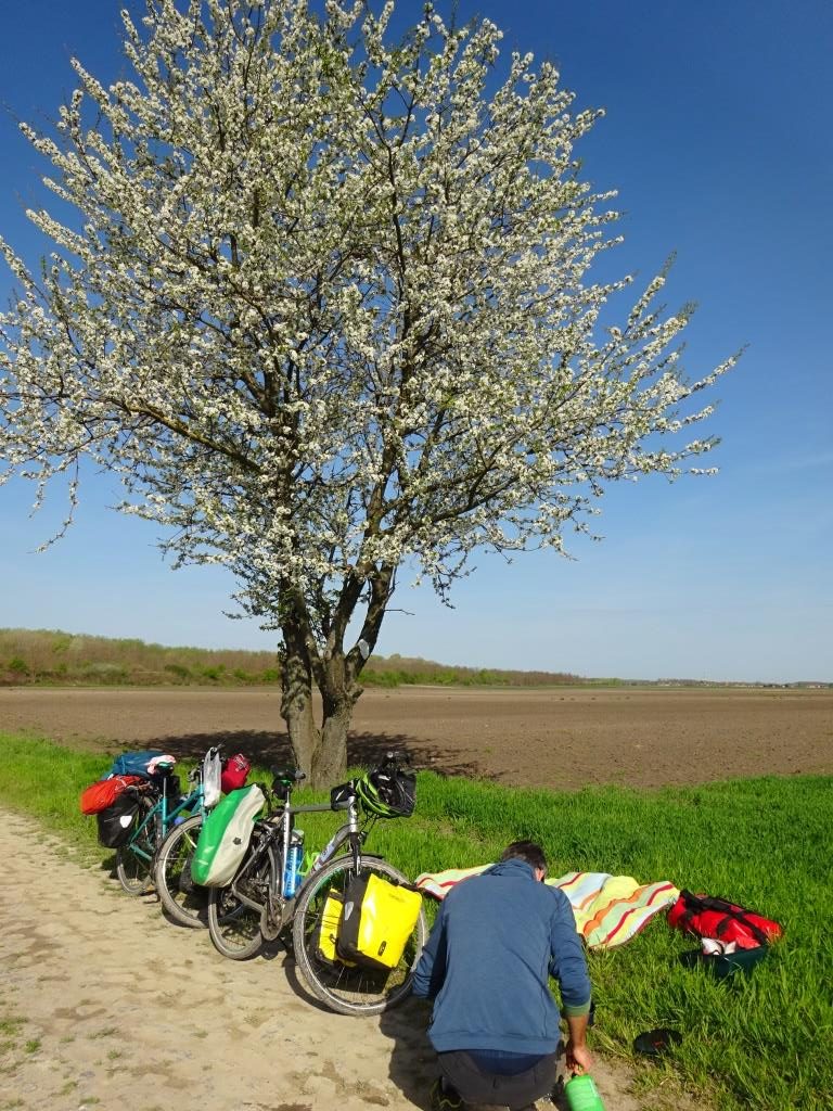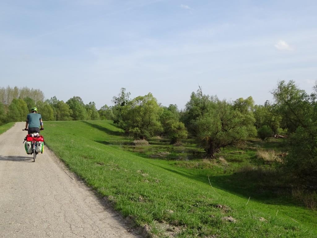 Der Weg am nächsten Tag ist sehr abwechslungsreich. Am Anfang schlängelt sich der Radweg an Obstbaumwiesen und kleinen Feldern mit vielen Löwenzahnblüten entlang, später fahren wir sehr viel an schier endlos scheinenden Feldern entlang und gegen Nachmittag sind wir wieder nah an der Donau, links Wald und rechts ein Sumpfgebiet mit sehr schönen Bäumen. Dank Gegenwind bekommen wir ein paar Wildschweine mit Babies vor die Linse, Fischreiher und Schwäne. An einer Stelle knackt es von links sehr laut und auf einmal kommt eine Herde Rehe aus dem Wald galoppiert und quert einmal den Damm auf dem wir fahren/nun stehen. Sehr schön 🙂