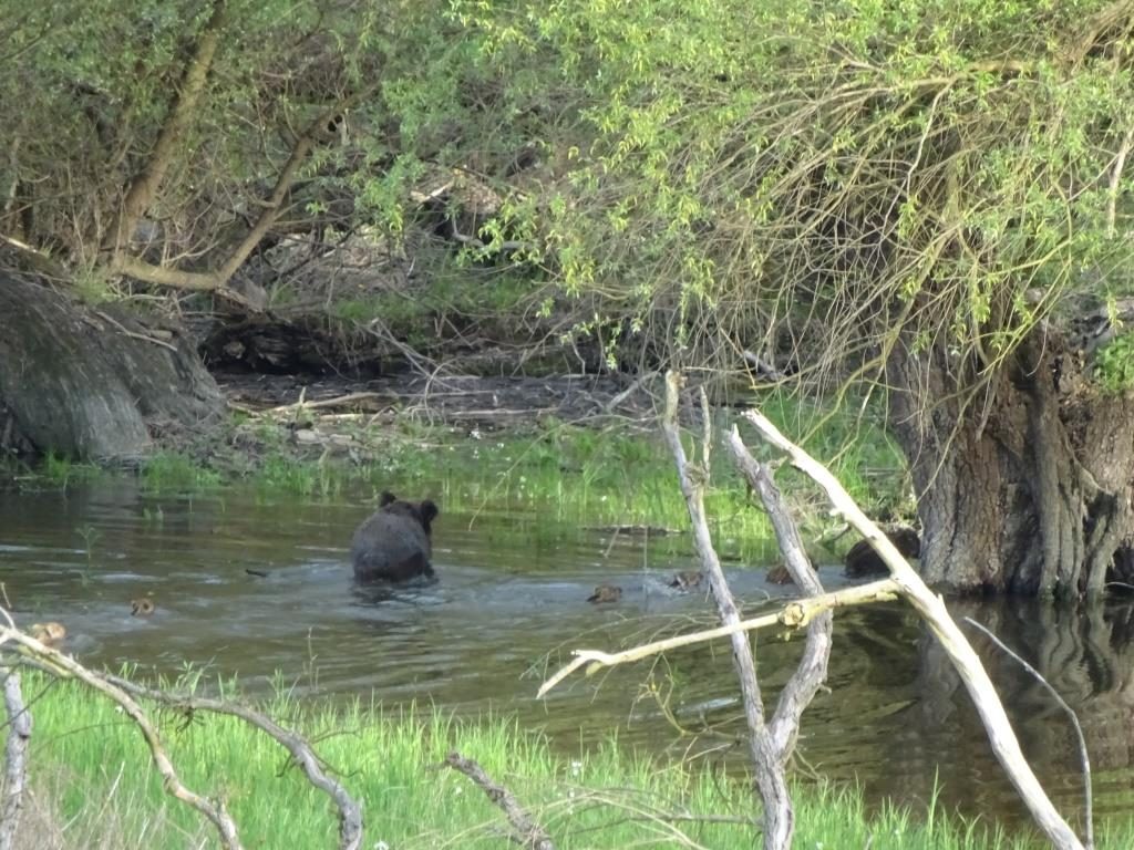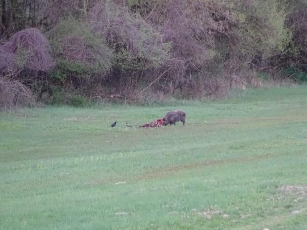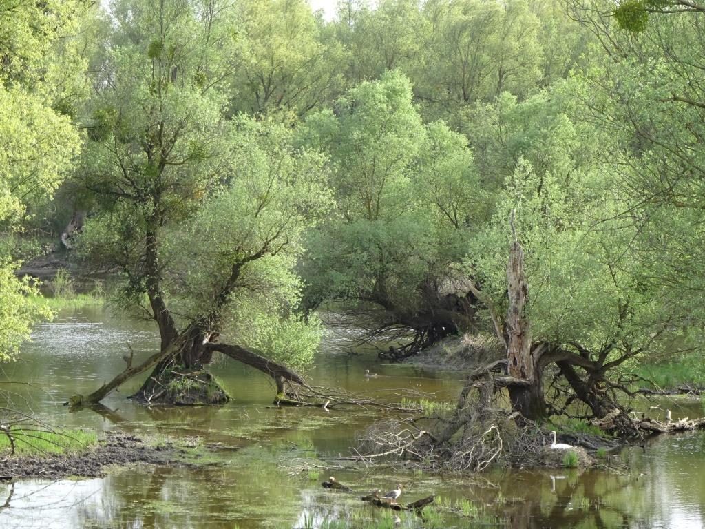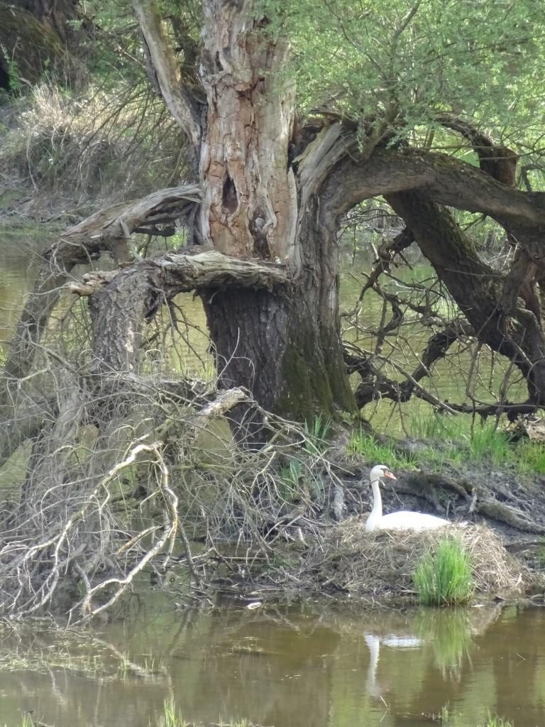 Der Weg am nächsten Tag ist sehr abwechslungsreich. Am Anfang schlängelt sich der Radweg an Obstbaumwiesen und kleinen Feldern mit vielen Löwenzahnblüten entlang, später fahren wir sehr viel an schier endlos scheinenden Feldern entlang und gegen Nachmittag sind wir wieder nah an der Donau, links Wald und rechts ein Sumpfgebiet mit sehr schönen Bäumen. Dank Gegenwind bekommen wir ein paar Wildschweine mit Babies vor die Linse, Fischreiher und Schwäne. An einer Stelle knackt es von links sehr laut und auf einmal kommt eine Herde Rehe aus dem Wald galoppiert und quert einmal den Damm auf dem wir fahren/nun stehen. Sehr schön 🙂