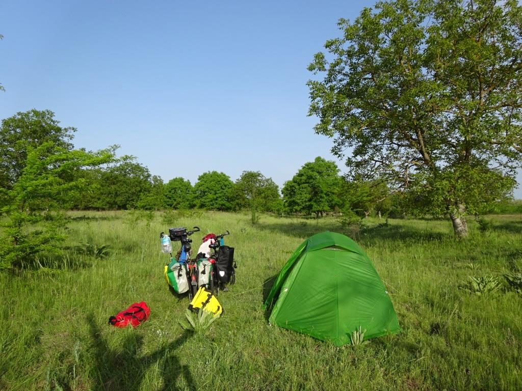 Gut erholt nach unserem Ruhetag fahren wir weiter. Nächstes größeres Ziel in einigen Tagen: Russe. Dazwischen nur kleine Dörfer/Städtchen und wild campen ist angesagt. Die Strecke ist nun sehr hügelig, und das ändert sich vorerst auch nicht mehr. Mücken sind ein großes Problem, gerade abends, wenn man nochmal bergauf muss und langsam fährt, wird man schon angefallen und natürlich dann am Abend, wenn man einfach nur in Ruhe sein Zelt aufbauen möchte… oder auch in der Mittagspause.. garstige Biester, da hilft nur Vollverschleierung ^^ Die bulgarischen Dörfer wirken zum Teil komplett verlassen, man sieht nur baufällige Häuser und fast keine Menschen, in anderen Dörfern hingegen ist man dann überrrascht, wenn mal „was los ist“ :). Sehr angenehm sind die Trinkwasserbrunnen, die es in fast jedem Dorf gibt, und wo wir gerne unsere Flaschen auffüllen.