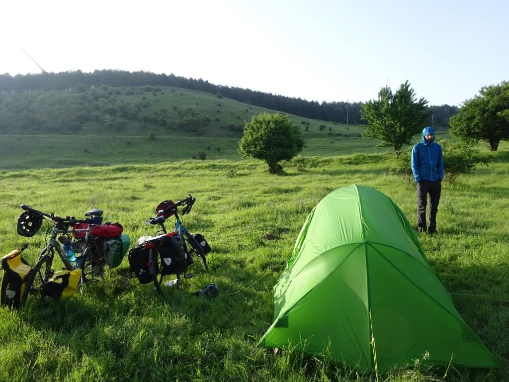 Weiter geht die Fahrt. Wir frühstücken in Nikolov. Am frühen Nachmittag habe ich ein richtiges Energietief, kann nur äußerst schwerfällig fahren.. Da ziehe ich mir im nächsten Dorf am obligatorischen Kaffeeautomaten einen kleinen „Wiener Kaffee“ mit Zuckerkristallen am Boden und trinke einen schönen Eistee. Schwups fahre ich dem Mäxchen davon. Ist schon irgendwie witzig, man funktioniert ein bisschen wie ein Auto 😀 Später am Tag sind wir in Shishtov, hier essen wir eine bulgarische Kleinigkeit (Misch-Masch 😀 – Schafskäse, Gemüse und Ei vermischt) und trinken ein Bierchen, bevor es noch ein Stückchen weiter geht und wir auf einer zukünftigen Walnussbaum-Plantage zelten. Walnussbäume gibt’s hier wirklich sehr viele, wann immer man sich in den Schatten stellt, steht man eigentlich unter einem Walnussbaum. 77 km.