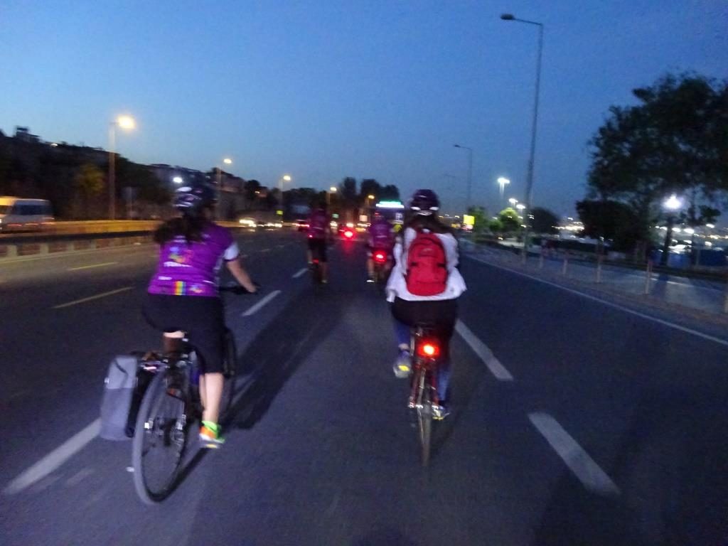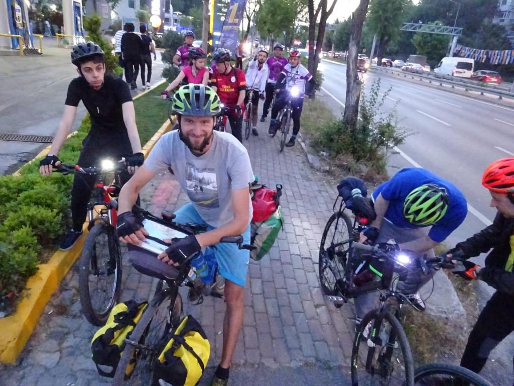 Nun, nach Istanbul wollen wir noch und erst gegen 17 Uhr schaffen wir es, weiter zu fahren.. Es sind noch zwei größere Hügel zu erklimmen, danach wird es etwas angehmer zu fahren. Die meiste Zeit bleiben wir von großen Straßen fern und nähern uns langsam an. Dann geraten wir doch auf eine Autobahn-ähnliche Straße und es wird etwas hektisch.. allerdings ist der Seitenstreifen wirklich breit und immerhin kommt man flott voran (perfekt geteert, keine Steigung :)). Kurze Paue an einem Melonenstand, dann weiter. Am Ende fahren wir auf einer 3- bis 4-spurigen Straße daher, ganz selten sehen wir vereinzelte Radfahrer. Plötzlich aber steht am Straßenrand ein Rennradfahrer und ruft uns etwas zu, wir fahren an den Rand und da steht eine ganze Gruppe von Rennradfahrern (10-15 Leute) und ist ganz begeistert, uns zu sehen. Sie treffen sich 1x die Woche, um die Straßen unsicher zu machen und eine flotte Runde am Rand von Instanbul zu drehen. Wir fahren dann alle zusammen und nehmen schön eine ganze Spur der befahrenen Straße ein. So fahren wir klingelnd und pfeifend ins Istanbuler Stadtzentrum.. Echt cool :)! Um kurz vor 10 und nach 90 km erreichen wir endlich unsere Wohnung mit schönem Ausblick auf den Bosporus 🙂