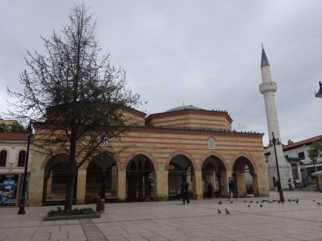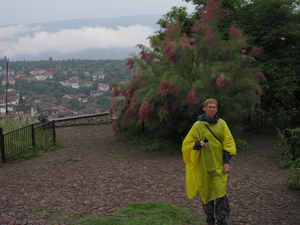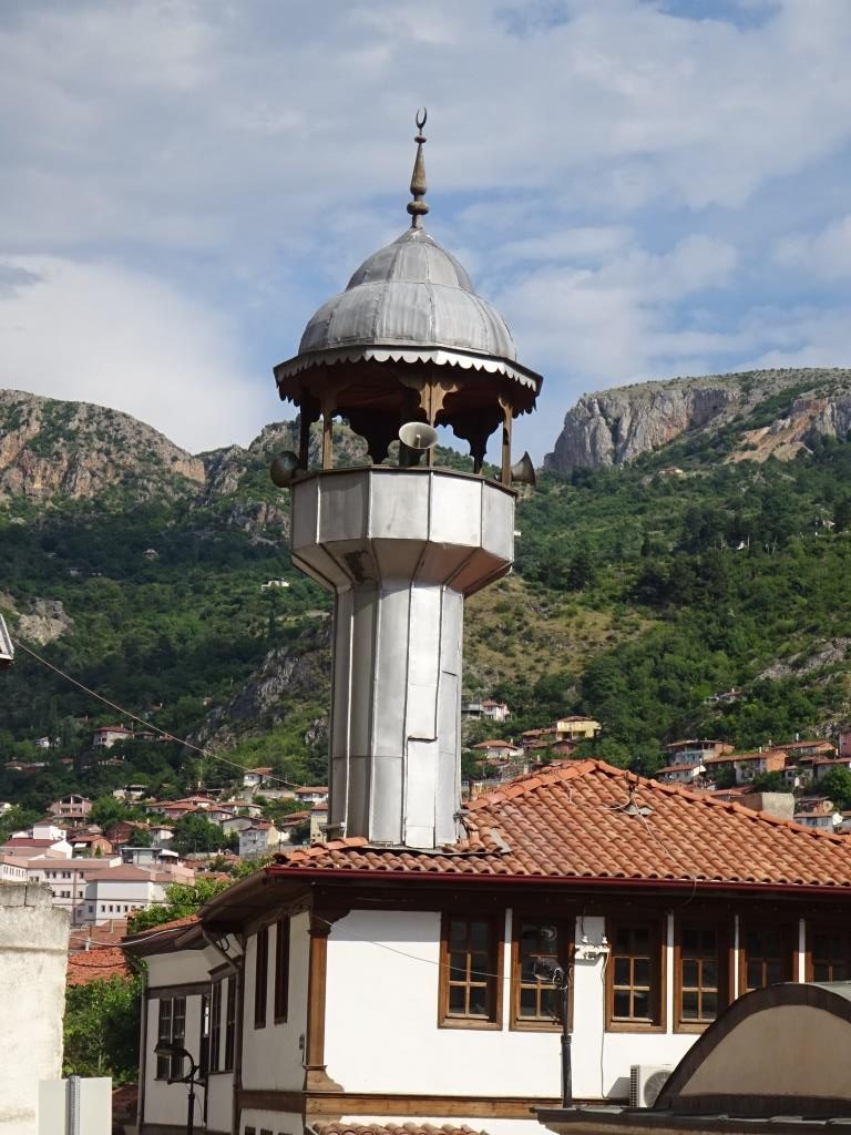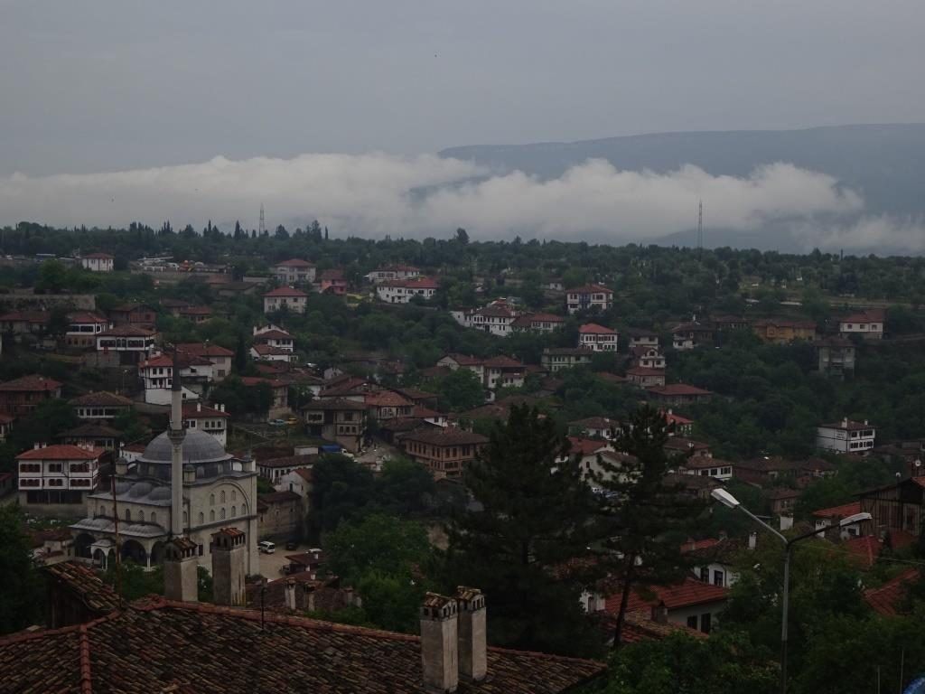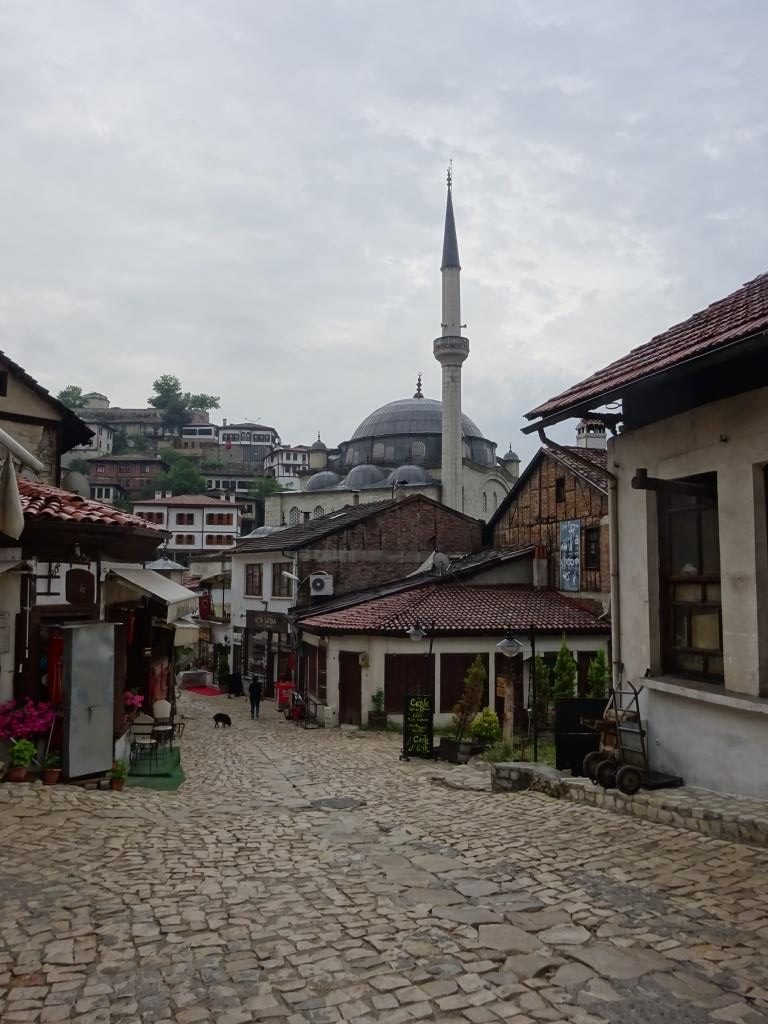 Nun geht es die nächsten Tage mit zumeist „angenehmer“ Steigung bis auf 1000 m hoch und wir verplanen mit schöner Regelmäßigkeit das Frühstück, meist fehlt es an etwas (Müsli oder Milch :D) und es kommt dann erstmal kein Laden auf der Strecke. So fahren wir am nächsten Tag ca. 40 km bis Karabück, die meiste Zeit „eingesperrt“ in einer Tunnelpiste zwischen den Bergen. Dort kaufen wir ein und „frühstücken“ während eines Gewitters geschützt unter Pavillons. In der Fußgängerzone werden wir von 2 Polizisten angesprochen, die sich gleich einen Dolmetscher von der Straße greifen. Wo kommen wir her, wo gehen wir hin, wo schlafen wir, wie sieht unser Beziehungsstatus aus? Tsss „we are married, of course :D“. Beifallendes Nicken folgt.. Unser Dolmetscher legt uns sehr ans Herz, dass wir nach Safranbolu fahren sollen (noch mehr bergauf). Machen wir aber dann noch und es lohnt sich. Eine sehr schöne Altstadt, UNESCO Weltkulturerbe. Achso, es regnet dann ganz schön heftig auf dem Weg dahin und trotz des super Capes sind wir ganz schön verfröstelt und nass. Wir wärmen uns bei einem kleinen Kahve und Safranreispudding auf und gucken die Stadt an, danach fahren wir raus, wollen eigentlich mal ausprobieren, an einer Tankstelle zu übernachten, aber die sehen nicht so gut aus. So schlagen wir uns hinter einem Dorf in die Büsche und campen zwischen Komposthügeln auf einer schönen Blumenwiese.
