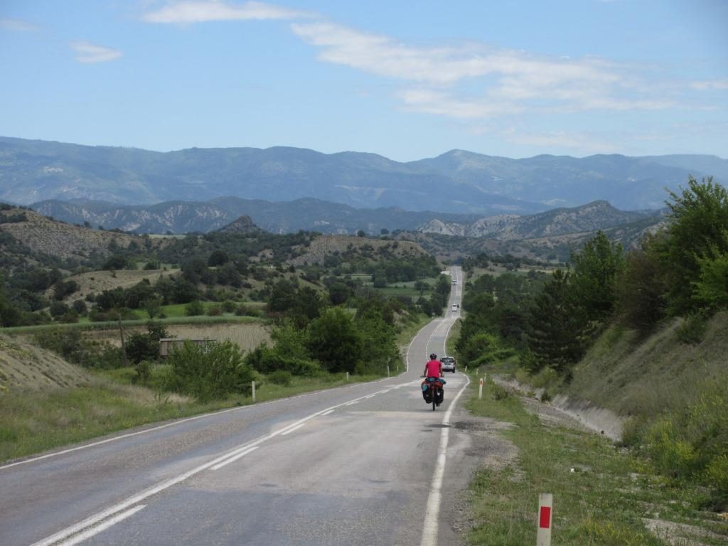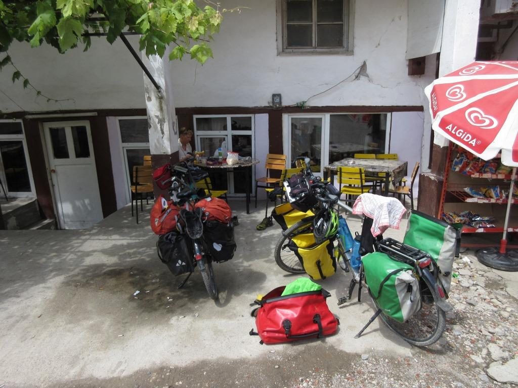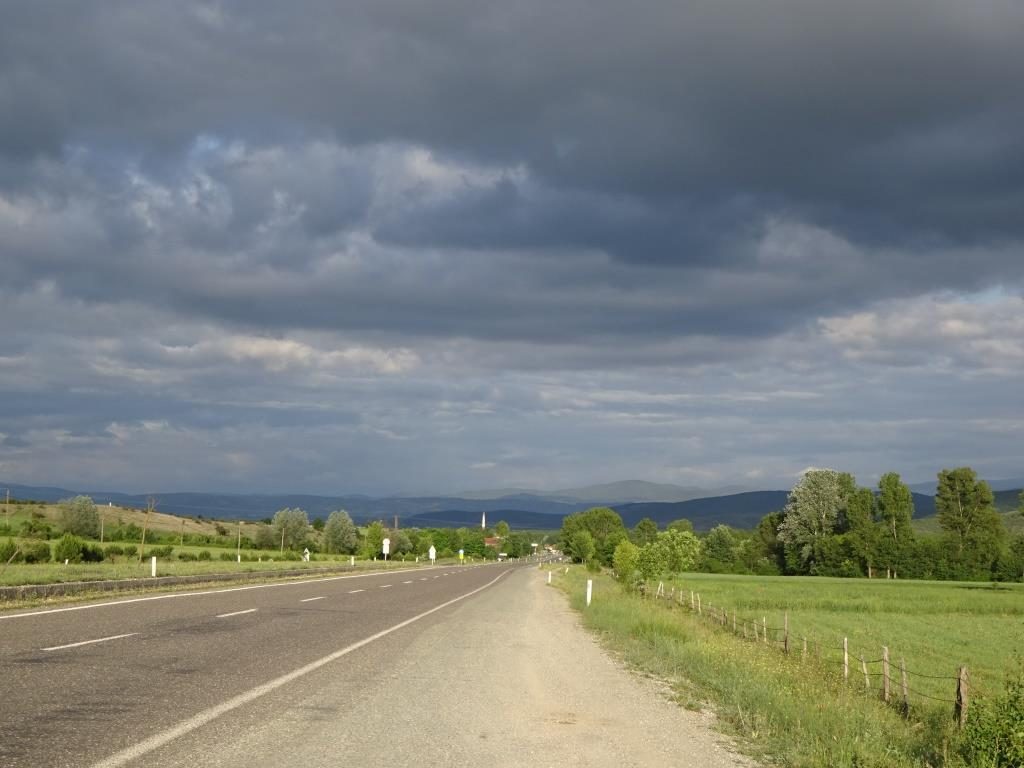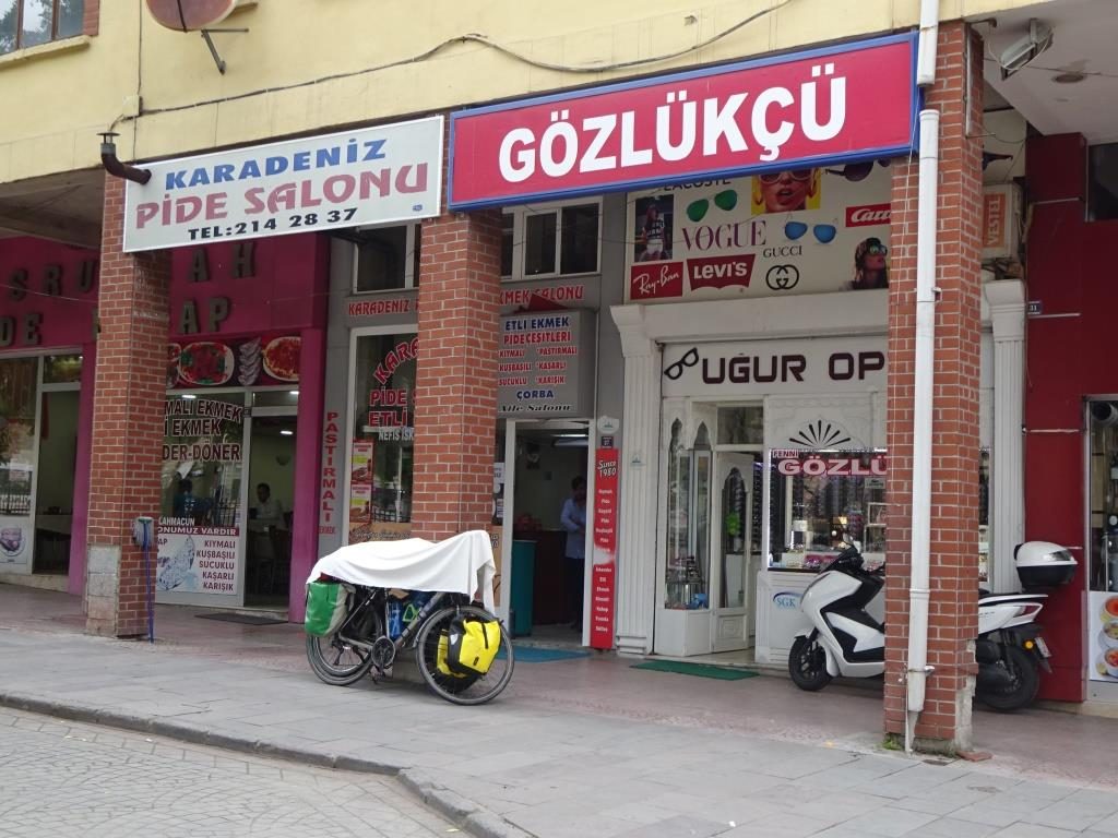 Nachts und morgens regnet es dann und mit etwas depressiver Stimmung geht es nach einem Çay dann auf den erstmal höchsten Punkt (1240 m) hoch. Als militante Nichtraucher haben wir uns gegen ein Frühstück in der Tankstelle entschieden und um Gepäckgewicht zu sparen auch keine Milch gekauft.. Oh oh.. auf den nächsten vielen Kilometern gibt es aber keine Milch zu kaufen und so gibt es nur Nüsse, Salzgebäck und Fertigkuchen statt Frühstück..Kühl ists hier oben, aber zum Glück klart das Wetter auf. In Kastamonu gibt’s dann Dürüm und Co., ein Optiker passt auf unsere Räder auf und wir machen einen kurzen Stadtrundgang. Danach fahren wir gemäßigt bergab und suchen uns einen Platz fürs Zelt zwischen den umliegenden Dörfern.
