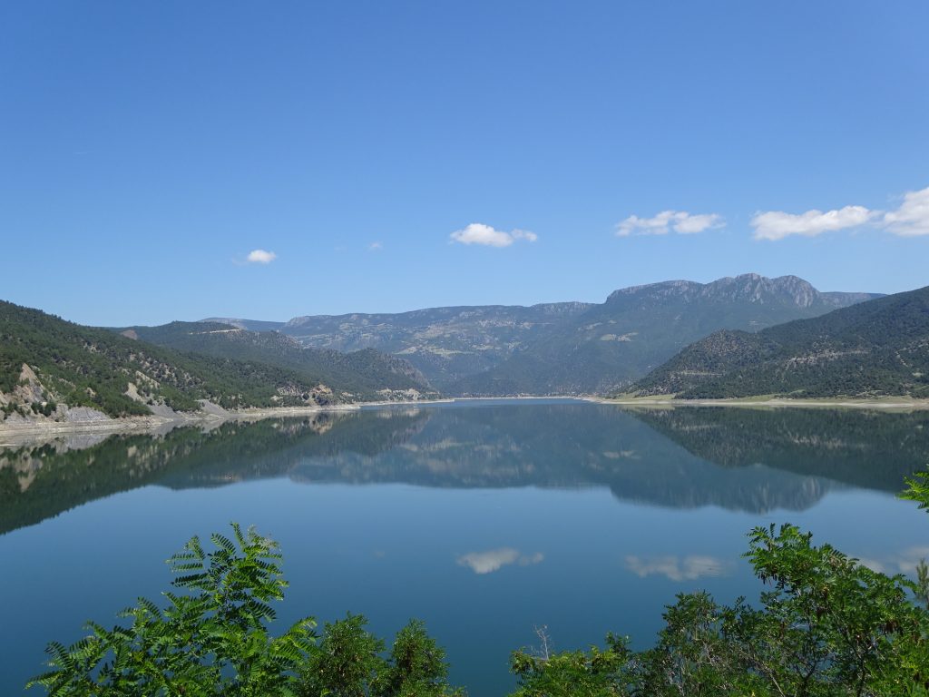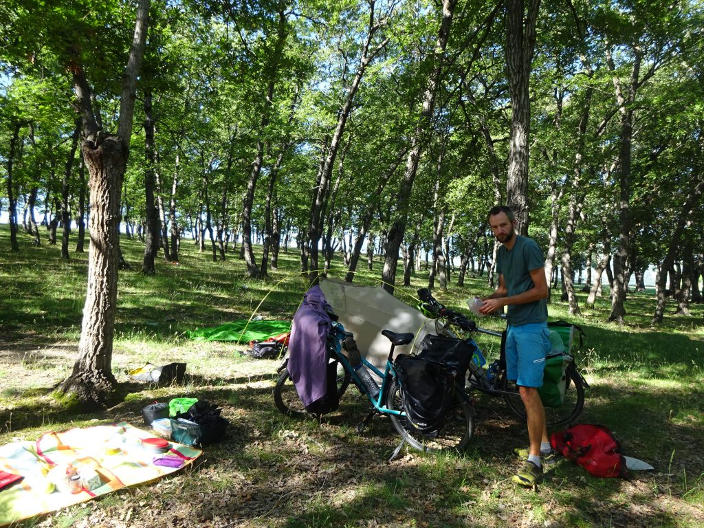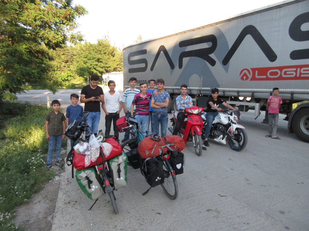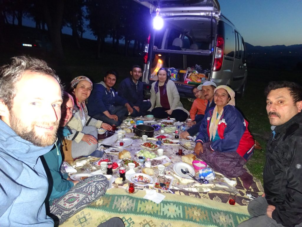 Nach einer recht unruhigen Nacht (laute Autos fahren hin und wieder vorbei, Muezzin, Hunde.. ^^) geht es am nächsten mit Frühstück weiter Richtung Stausee, den wir im Norden umschleifen. Strecke leicht hügelig. In Vezirköprü kaufen wir ein und im nächsten Dorf versorgen wir uns noch mit Wasser, was die gesamte Dorfjugend auf den Plan ruft. Später finden außerhalb dann einen Hügel mit Bäumen, der auch zum Picknicken genutzt wird. Wir wollen erstmal kochen, die Lage sondieren und dann in der Dämmerung/im Dunkeln das Zelt aufschlagen. In der Nähe hat eine Familie ihr Piknick aufgebaut, der Ramadan-Ess-Ruf des Muezzins ertönt und es kann losgehen. Kurze Zeit später kommt eine der Frauen zu uns mit Grillgut und Salat 🙂 Eine Minute später ist sie nochmal da, mit Melonen und einem großen Brot. Dann fragt sie, ob wir Çay wollen, ja gerne! Damit sie nicht nochmal hin und her läuft verfolgen wir sie direkt und dann sitzen wir schon mit der Familie um die große Picknikdecke verteilt, es wird noch etwas angebaut, Schuhe natürlich ausziehen und los geht das Gespachtel 🙂 Dazu Unmengen Çay, türkische Cola und am Ende dann Sonnenlumenkerne, die wir jetzt ja schon professionell futtern können 🙂 Ein schöner Abend mit witziger Unterhaltung mit nur kurzen Einschüben von google Translate.